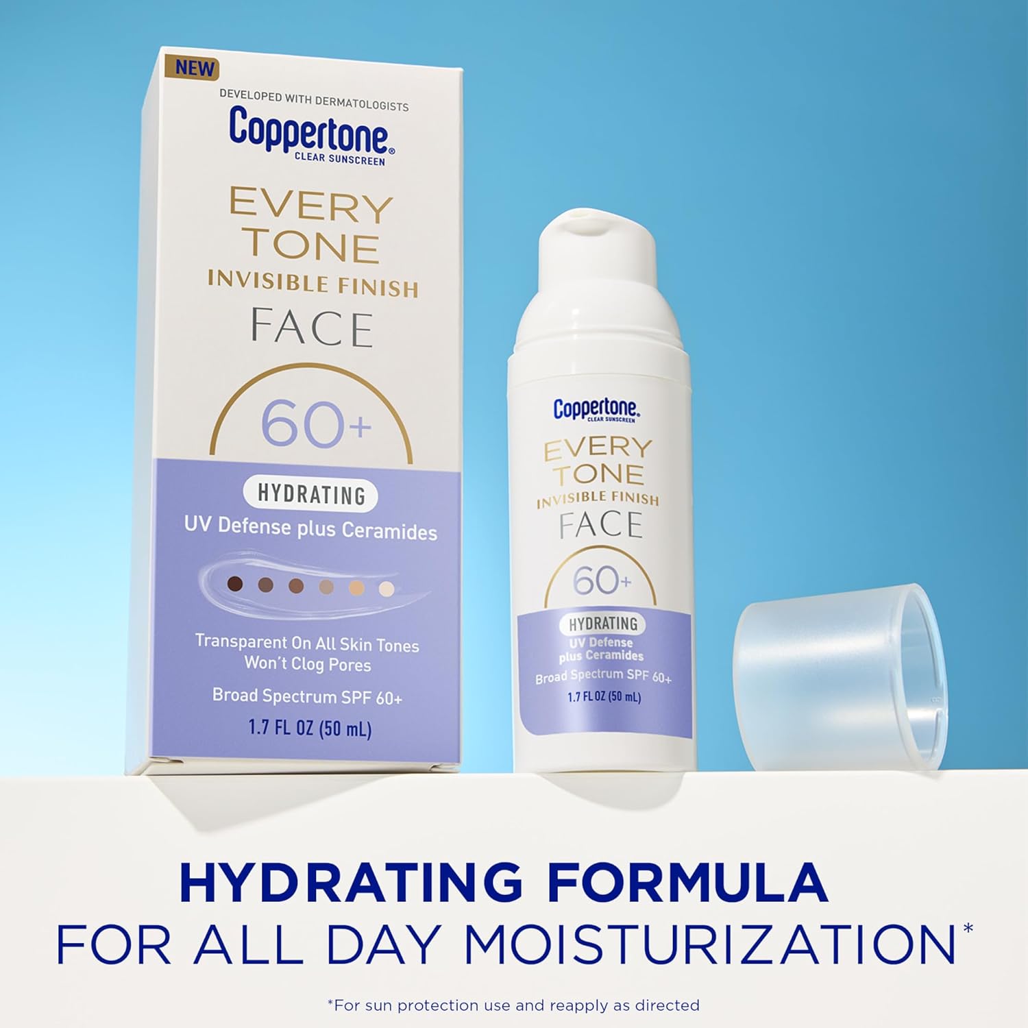 About this item INVISIBLE FINISH: Developed with dermatologists, this lightweight sunscreen blends in clear, leaving an invisible finish on all skin tones and is great for everyday use MOISTURIZING SUNSCREEN: Hydrating sunscreen formula is enriched with ceramides and leaves skin feeling soft and moisturized DAILY USE: Non-comedogenic sunscreen layers invisibly under makeup UV PROTECTION: Broad Spectrum sunscreen for face stops up to 98% of damaging UV rays FREE OF: Coppertone's clear sunscreen is free from oxybenzone, octinoxate, PABA, phthalates and dyes INCLUDES: One (1) 1.7 fluid ounce pump bottle of Coppertone Every Tone Invisible Finish Hydrating UV Defense Face Sunscreen SPF 60+  See more product details,INVISIBLE FINISH: Developed with dermatologists, this lightweight sunscreen blends in clear, leaving an invisible finish on all skin tones and is great for everyday use,MOISTURIZING SUNSCREEN: Hydrating sunscreen formula is enriched with ceramides and leaves skin feeling soft and moisturized,DAILY USE: Non-comedogenic sunscreen layers invisibly under makeup,UV PROTECTION: Broad Spectrum sunscreen for face stops up to 98% of damaging UV rays,FREE OF: Coppertone's clear sunscreen is free from oxybenzone, octinoxate, PABA, phthalates and dyes,INCLUDES: One (1) 1.7 fluid ounce pump bottle of Coppertone Every Tone Invisible Finish Hydrating UV Defense Face Sunscreen SPF 60+