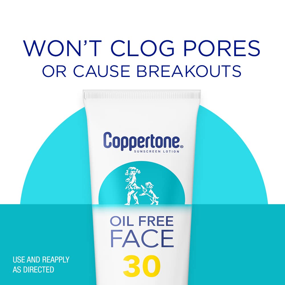 Maintain beautiful skin while protecting yourself against the sun with Coppertone Oil Free Sunscreen Face Lotion. Defend your skin against the sun's rays with this sunscreen that helps maintain vibrant, healthy-looking skin. Oil free, this formula delivers broad spectrum UVA/UVB protection without clogging your pores or causing breakouts. Leaving your skin feeling soft and smooth, this fragrance-free sunscreen is water resistant (80 minutes). Apply whenever your day takes you outside, on your morning commute, running errands, or spending a day at the beach with friends and family. This pack includes one (1) 3-fluid-ounce SPF 30 sunscreen lotion bottleThis oil free formula is hypoallergenic and delivers broad spectrum UVA/UVB protection without clogging your pores or causing breakoutsStops up to 97% of damaging UV rays; Defend your skin against the sun's rays with this sunscreen that helps maintain vibrant, healthy-looking skinLeaving your skin feeling soft and smooth, this fragrance-free sunscreen is water resistant (80 minutes)Apply whenever your day takes you outside, on your morning commute, running errands, or spending a day at the beach with friends and family