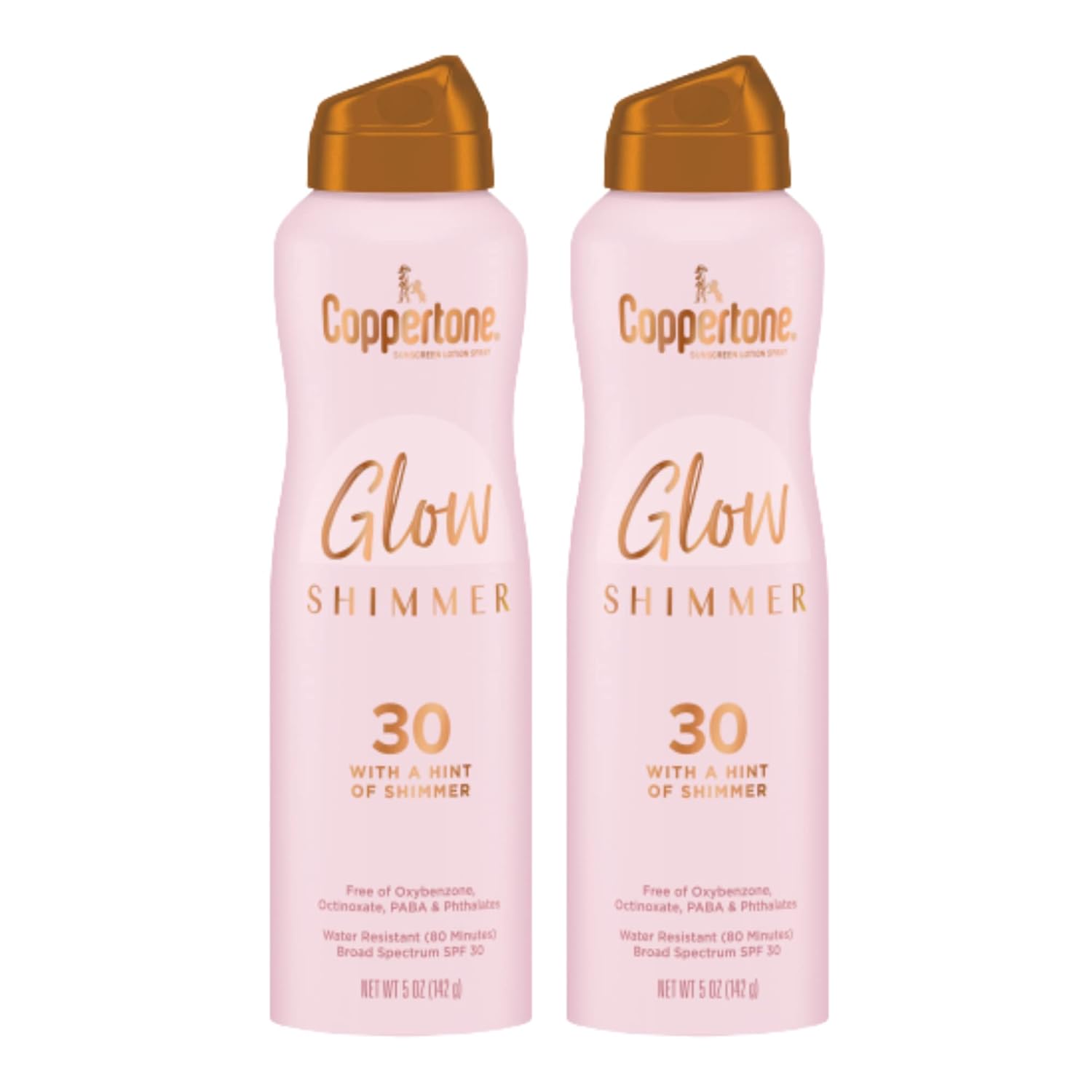 Includes two (2) 5 ounce bottles of Coppertone Glow with Shimmer SPF 30 Spray Sunscreen