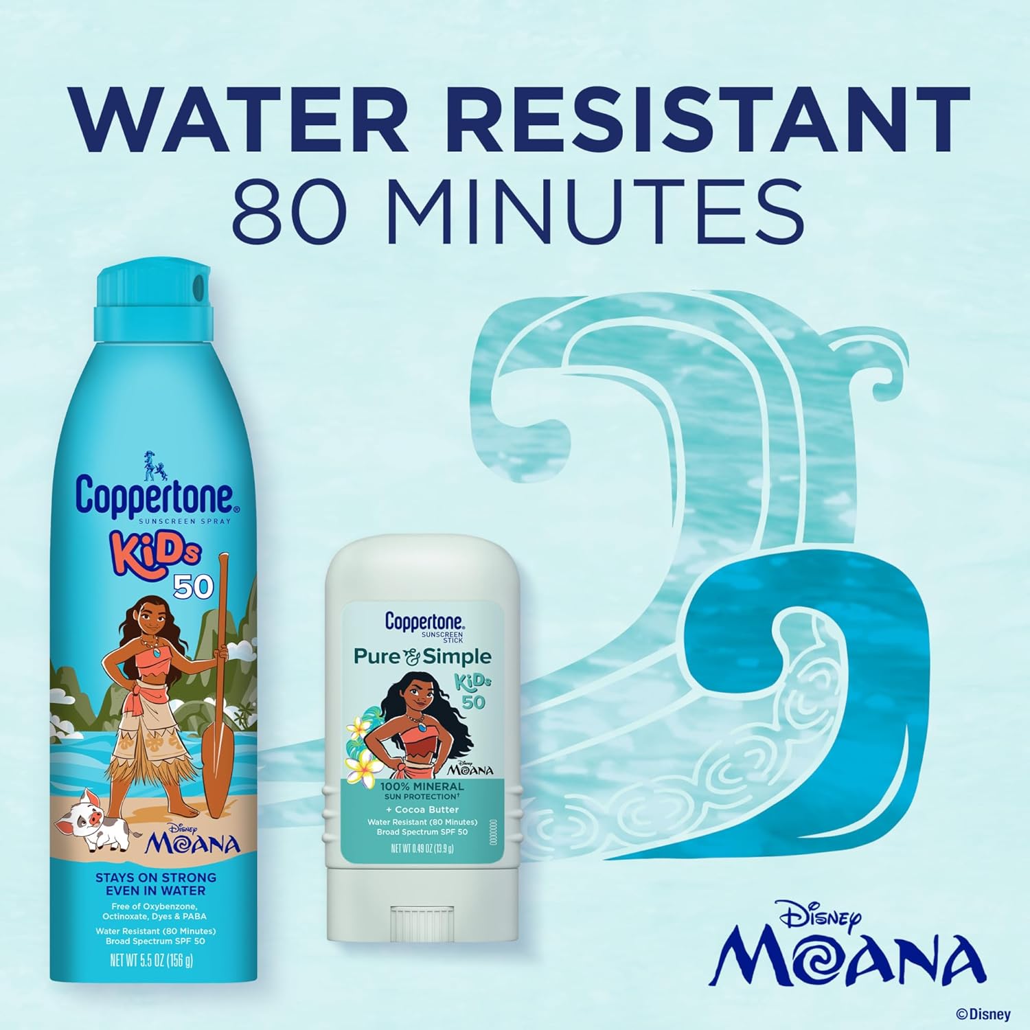 Coppertone Kids Exclusive Disney Moana Sunscreen Spray Spf 50 (5 Oz) + Coppertone Pure And Simple Kids Mineral Sunscreen Stick Spf 50 (0.49 Oz), Water Resistant, Oxybenzone And Octinoxate Free