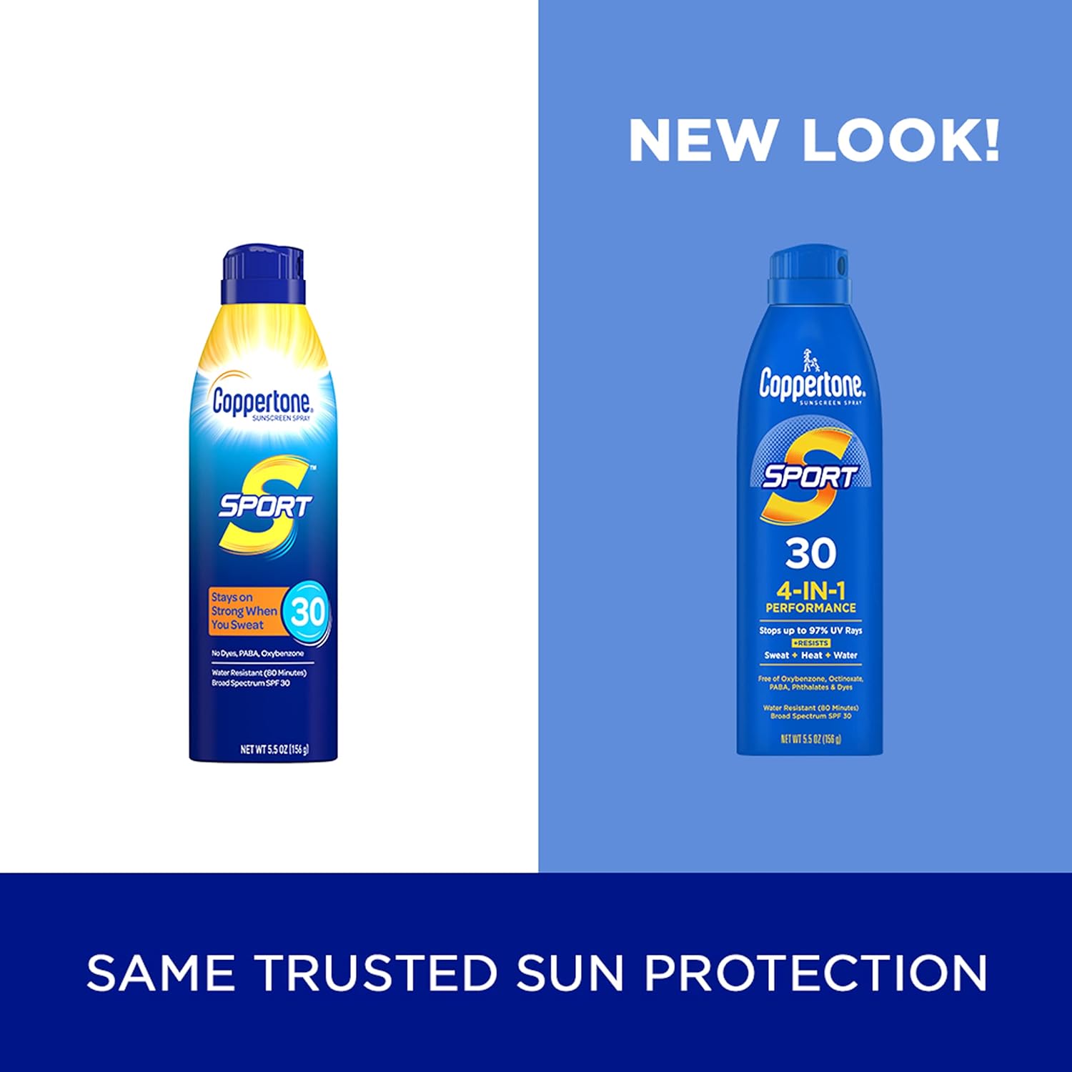 Whichever outdoor activity you’re passionate about, Coppertone Sport Sunscreen Spray is on your team. Designed to stay on strong when you sweat, this high-performance spray sunscreen SPF 30 protects you from the sun with a durable and water resistant sunscreen formula (80 minutes). This Coppertone spray sunscreen offers Broad Spectrum UVA/UVB protection in a moisturizing formula, and has a continuous sprayer for application on any angle. Each sunscreen Coppertone creates follows a tradition of trusted, quality sun protection products. Coppertone has been providing continuous innovation for more than 75 years, and is voted the most trusted sunscreen brand.(1) Depend on this tough sport sunscreen spray during any outdoor activities, whether you’re getting out for a work day, heading to the big game or enjoying an afternoon of fun in the sun. Use and reapply Coppertone sunscreen spray as directed. (1)Voted Most Trusted Sunscreen Brand by American Shoppers Based on the 2022 BrandSpark American Trust StudyEasy to Apply: Coppertone Sport spray on sunscreen has a continuous sprayer for application on any angle, and is easy to apply for quick, even coverageFree Of: Coppertone Sport Broad Spectrum Sunscreen Spray is free of oxybenzone, octinoxate, PABA, phthalates, & dyesTrusted Brand: Voted most trusted sunscreen brand by American shoppers based on the 2022 BrandSpark American trust studyIncludes two 5.5 ounce bottles of Coppertone Sport SPF 30 Sunscreen Spray
