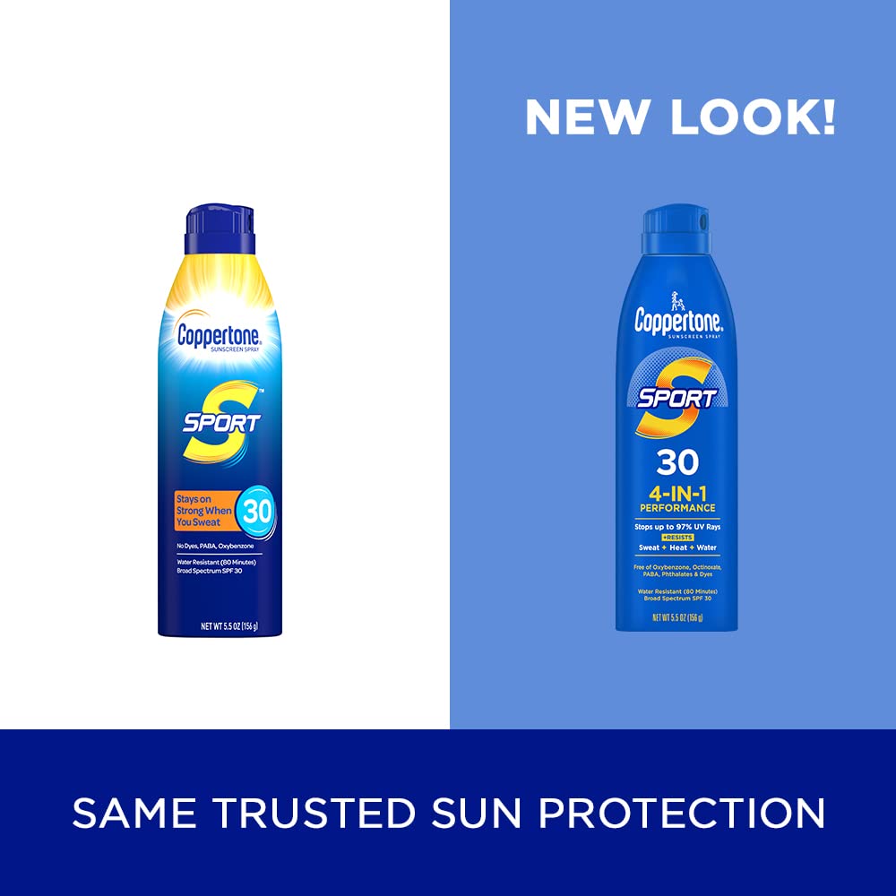 Whichever outdoor activity you’re passionate about, Coppertone Sport Sunscreen Spray is on your team. Designed to stay on strong when you sweat, this high-performance spray sunscreen SPF 30 protects you from the sun with a durable and water resistant sunscreen formula (80 minutes). This Coppertone spray sunscreen offers Broad Spectrum UVA/UVB protection in a moisturizing formula, and has a continuous sprayer for application on any angle. Each sunscreen Coppertone creates follows a tradition of trusted, quality sun protection products. Coppertone has been providing continuous innovation for more than 75 years, and is voted the most trusted sunscreen brand.(1) Depend on this tough sport sunscreen spray during any outdoor activities, whether you’re getting out for a work day, heading to the big game or enjoying an afternoon of fun in the sun. Use and reapply Coppertone sunscreen spray as directed. (1)Voted Most Trusted Sunscreen Brand by American Shoppers Based on the 2022 BrandSpark American Trust StudyEasy to Apply: Coppertone Sport spray on sunscreen has a continuous sprayer for application on any angle, and is easy to apply for quick, even coverageWater Resistant: Coppertone Sport SPF 30 sunscreen spray is water resistant (80 minutes), and stays on strong when you sweatFree Of: Coppertone Sport Broad Spectrum Sunscreen Spray is free of oxybenzone, octinoxate, PABA, phthalates, & dyesTrusted Brand: Voted most trusted sunscreen brand by American shoppers based on the 2022 BrandSpark American trust study