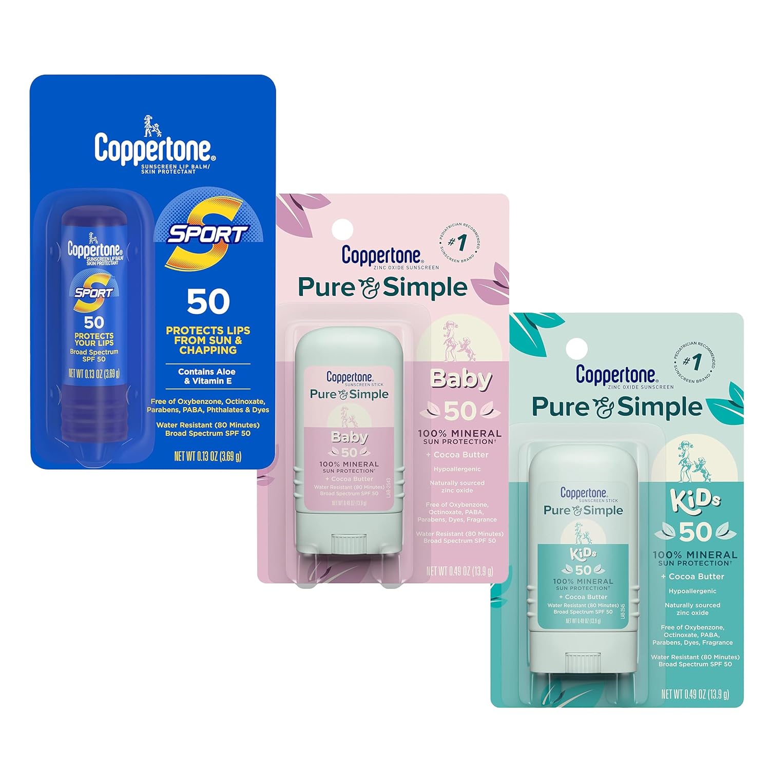 Coppertone Sunscreen Pack, Sport Spf 50 Sunscreen Lip Balm, 0.13 Oz Tube + Pure And Simple Baby Sunscreen Stick Spf 50, 0.49 Oz + Pure And Simple Kids Sunscreen Stick Spf 50, 0.49 Oz