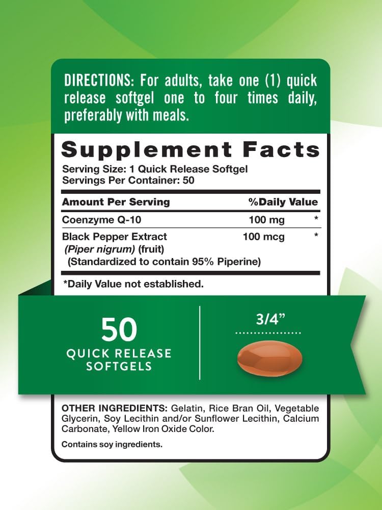 Coenzyme Q-10: Delivers 100Mg Of Coq-10 Per Softgel10Enhanced Absorption: Optimized With Black Pepper Extract For Maximum Daily Support10Purity & Potency: Nature'S Truth Delivers High-Quality Ingredients Tested For Purity And Potency10Experts You Can Trust: Backed By Three Generations Of Vitamin Innovators For Unrivaled Quality10Naturally Free Of: Gluten, Wheat, Yeast, Milk, Lactose, Artificial Flavor & Sweetener & Non-Gmo10