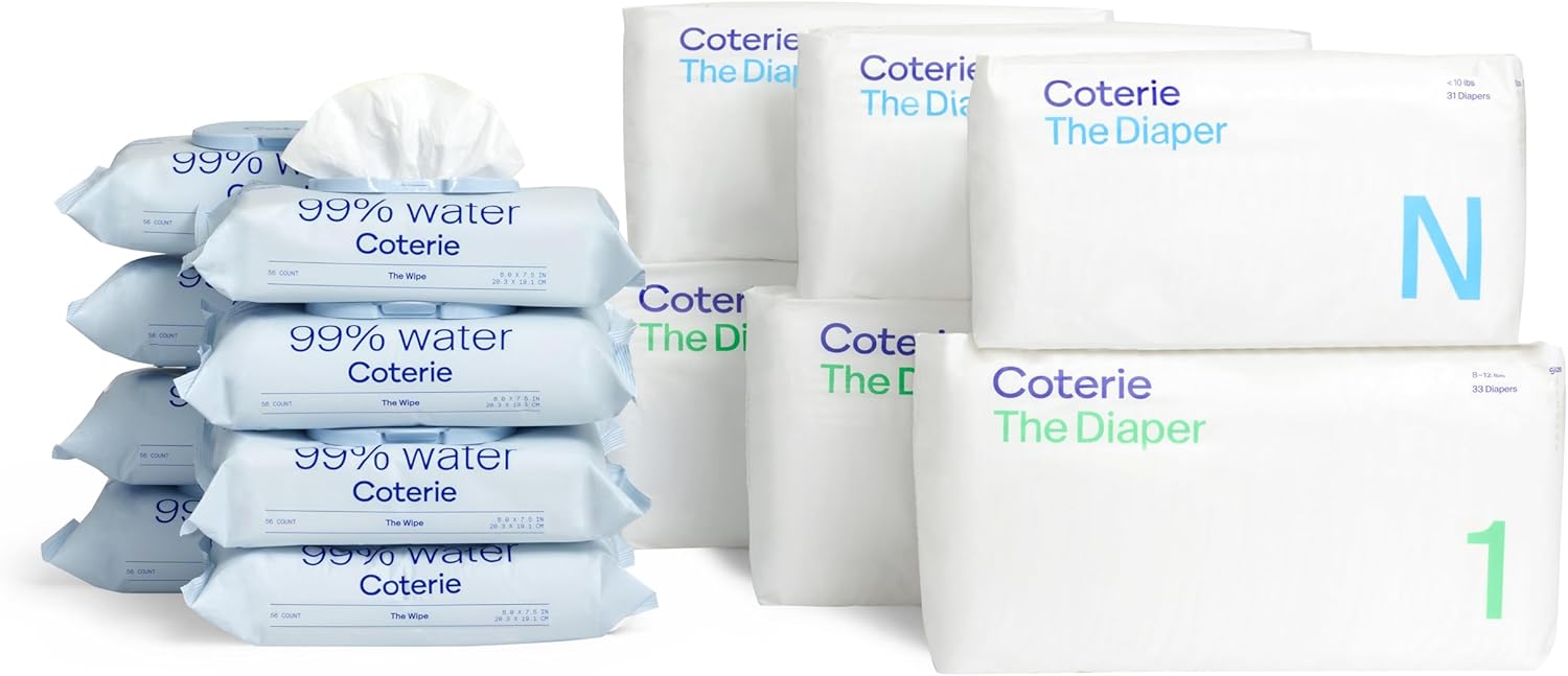Coterie Baby Diapers + Wipes Baby Kit, Size 1 (99 Count) Size Newborn (93 Count) 8 Wipe Packs (448 Count) Made With Plant Derived Fibers, Hypoallergenic, Designed For Sensitive Skin, Clean Ingredients