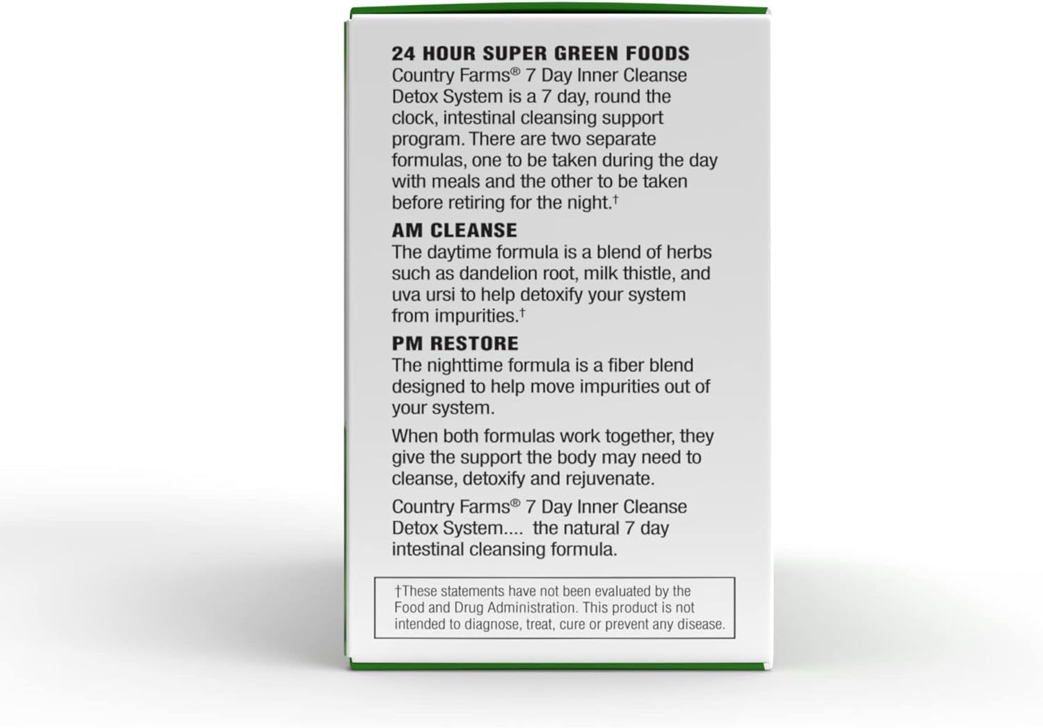 NATURAL DETOX & CLEANSE. Kick start weight loss with Country Farms 7 Day Inner Cleanse. This 7-day cleanse is a simple, easy-to-use detox system that provides 24-hour cleansing and digestive support, perfect for any diet regimen!