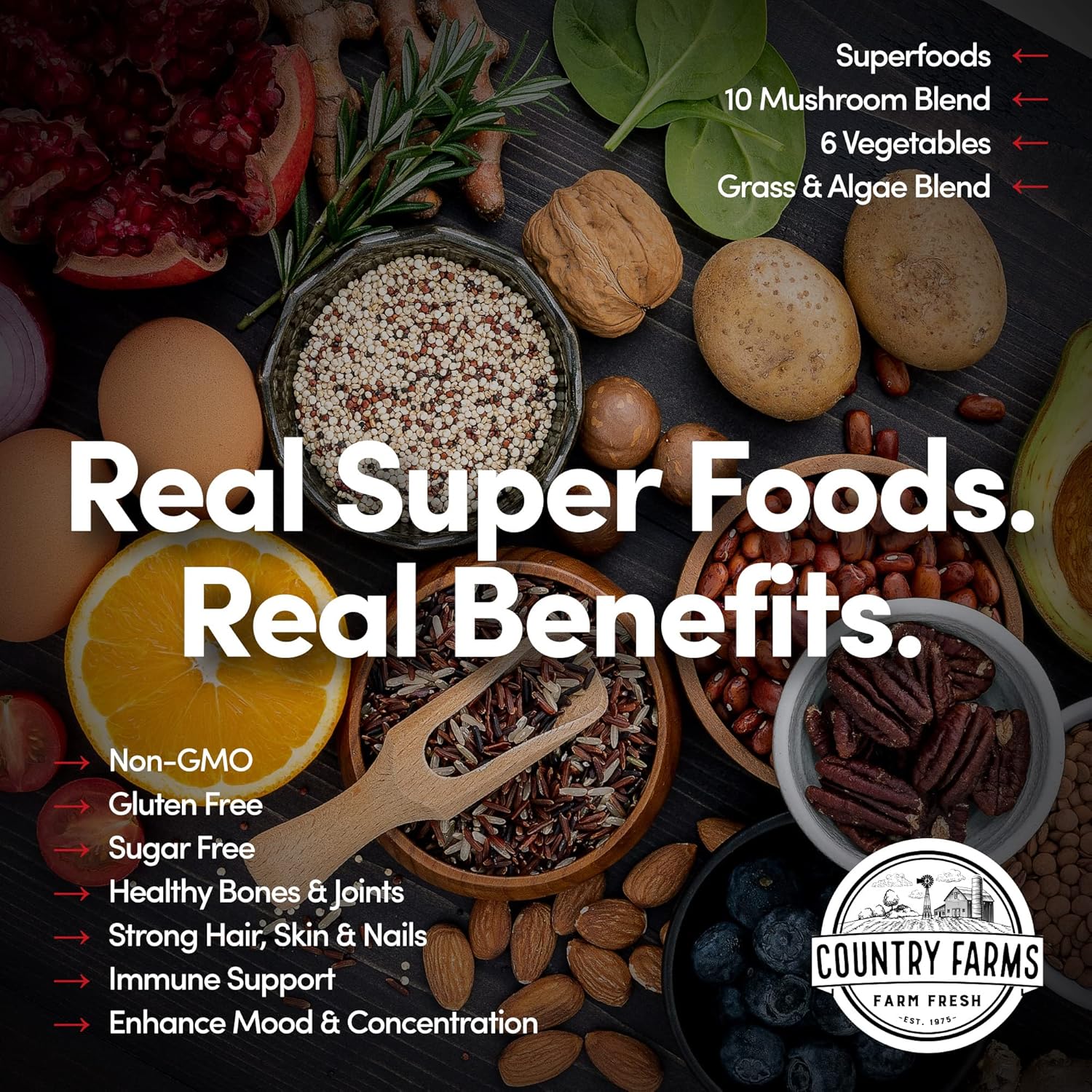 SUPPORTS MOOD AND FOCUS. Each scoop of Country Farms Collagen + Greens offers a variety of 10 mushrooms including, Maitake, Reishi, Lionās Mane and many more to support positive mood and promote focus