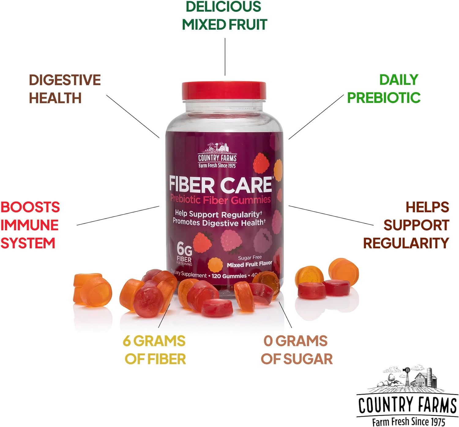 DESCRIPTION : Country Farms Fiber Care Prebiotic Gummies, 6g of Fiber Per Serving, FOS from Beets, Digestive Health, Supports Regularity, Mixed Fruit Flavor, 120 Gummies, 40 Servings, Multi