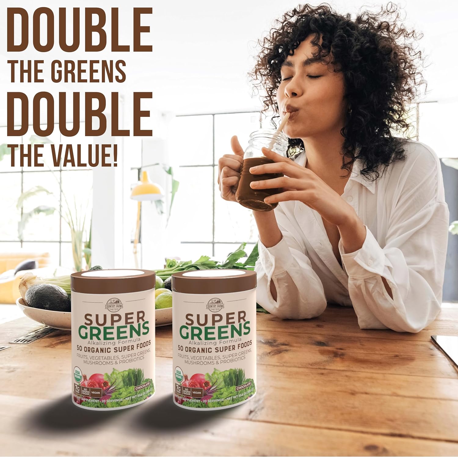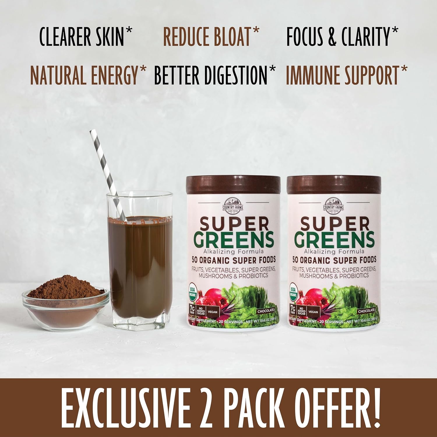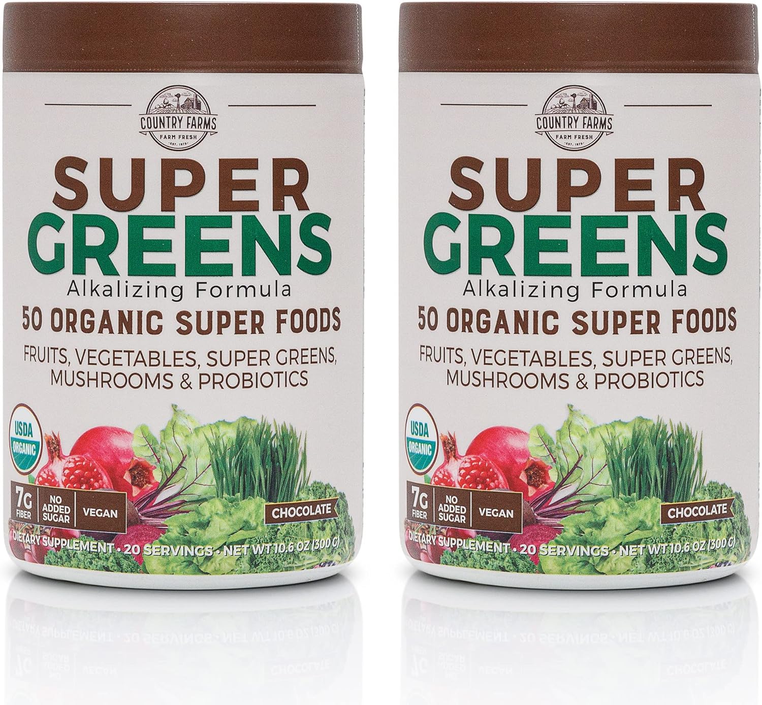 Country Farms Super Greens Chocolate Flavor, 50 Organic Super Foods, Usda Organic Drink Mix, Fruits, Vegetables, Super Greens, Mushrooms & Probiotics, Supports Energy, 40 Servings, 10.6 Oz, 2 Pack