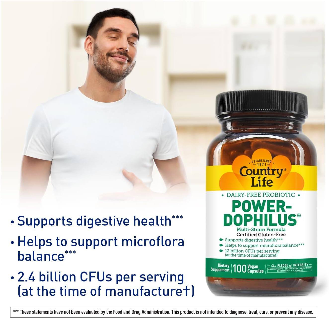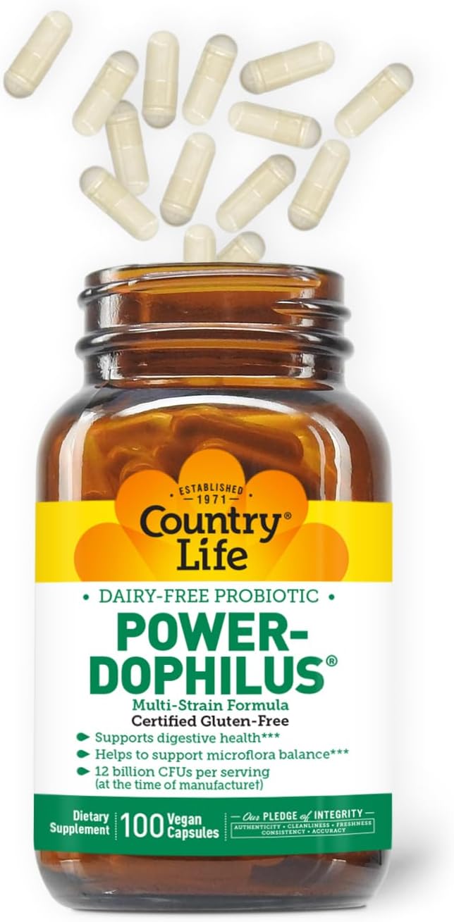About this item Ultimate Digestive Support: With 12 billion CFUs per serving, our potent probiotics bolster digestive health for men, women, and kids, promoting a balanced gut and optimal microflora in both the small and large intestines. Advanced MAKTrek Delivery System: Our Acidophilus probiotic is specially encapsulated in the MAKTrek delivery system, ensuring probiotics survive stomach acid to reach your gut alive, boosting their efficacy. Certified Gluten-Free and Vegan: Country Life’s commitment to health means our probiotics are Certified Gluten-Free by GFCO and Certified Vegan by AVA, so you can trust you're only getting natural, beneficial ingredients. Good for you Ingredients: Free from GMOs, artificial colors, flavors, sweeteners, and preservatives, our probiotics are a pure choice for supporting your digestion and overall gut health without unnecessary additives. Tailored for Optimal Gut Health: Designed with four diverse probiotic strains, our supplement provides comprehensive support for daily probiotic needs, enhancing digestive health and promoting a robust immune system. › See more product details,Ultimate Digestive Support: With 12 billion CFUs per serving, our potent probiotics bolster digestive health for men, women, and kids, promoting a balanced gut and optimal microflora in both the small and large intestines,Advanced MAKTrek Delivery System: Our Acidophilus probiotic is specially encapsulated in the MAKTrek delivery system, ensuring probiotics survive stomach acid to reach your gut alive, boosting their efficacy,Certified Gluten-Free and Vegan: Country Life’s commitment to health means our probiotics are Certified Gluten-Free by GFCO and Certified Vegan by AVA, so you can trust you're only getting natural, beneficial ingredients,Good for you Ingredients: Free from GMOs, artificial colors, flavors, sweeteners, and preservatives, our probiotics are a pure choice for supporting your digestion and overall gut health without unnecessary additives,Tailored for Optimal Gut Health: Designed with four diverse probiotic strains, our supplement provides comprehensive support for daily probiotic needs, enhancing digestive health and promoting a robust immune system