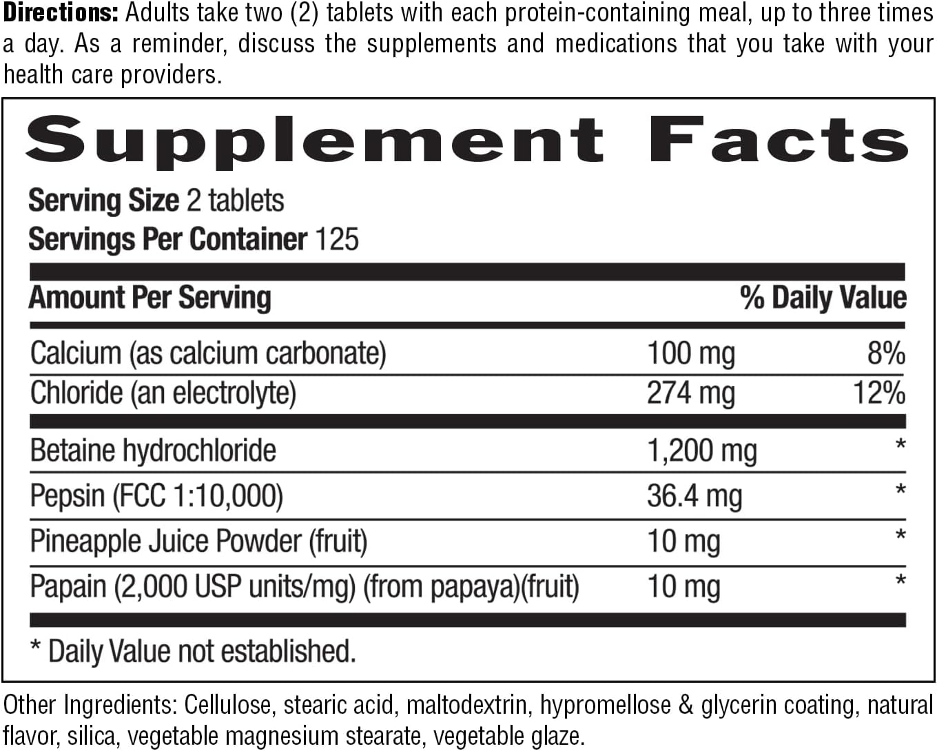 About this item Betaine hydrochloride β Helps support digestion in the stomach by providing a source of hydrochloric acid Digestive aid β Provides the enzymes pepsin, papain and bromelain to support digestive health Dietary supplement β Take with protein-containing meals Certified β Certified by Gluten Free by GFCO βΊ See more product details,Betaine hydrochloride β Helps support digestion in the stomach by providing a source of hydrochloric acid,Digestive aid β Provides the enzymes pepsin, papain and bromelain to support digestive health,Dietary supplement β Take with protein-containing meals,Certified β Certified by Gluten Free by GFCO