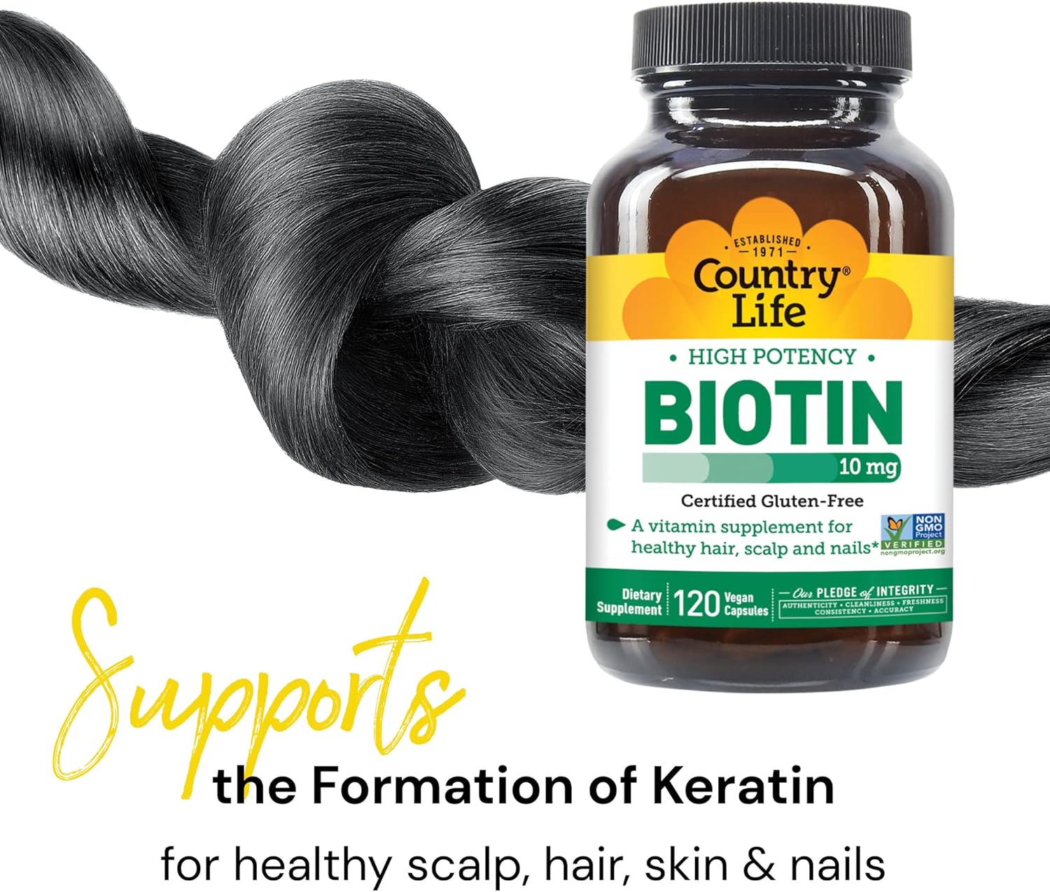 DESCRIPTION : Country Life Biotin High Potency, 10mg, 120 Count, Certified Gluten Free, Certified Vegan, Verified Non GMO120 Count (Pack of 1)