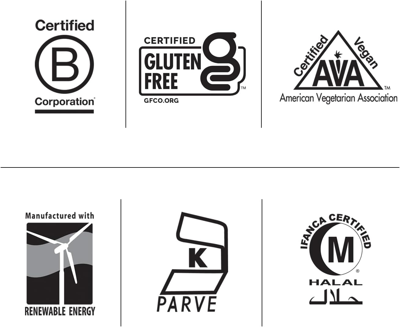 Certified - Certified Gluten Free by GFCO, Certified Vegan by AVA, Certified Halal by IFANCA