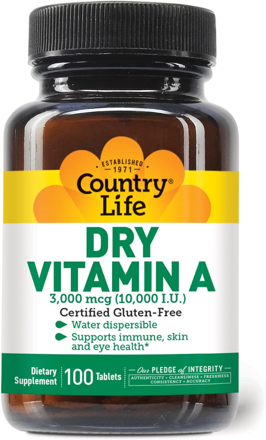Country Life Dry Vitamin A, Supports Immune, Skin & Eye Health, 10,000 Iu, 100 Tablets, Certified Gluten Free, Certified Vegan, Certified Halal