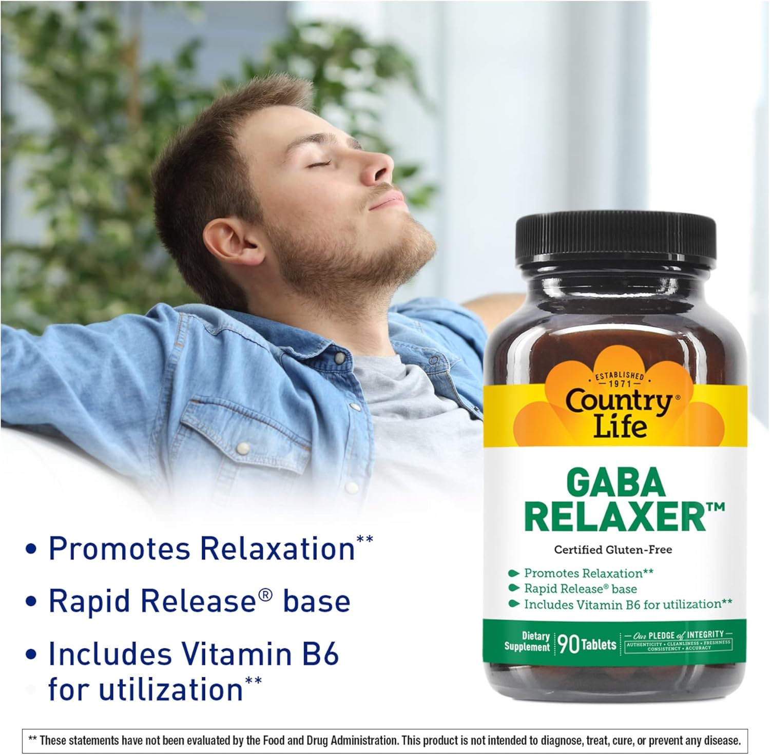 About this item Supports Relaxation & Better Sleep: Country Life GABA Relaxer features Gamma-Aminobutyric Acid (GABA), an amino acid known to help calm the mind and body. This powerful formula supports relaxation, focus, and healthy sleep patterns—ideal for winding down naturally.** Unique Amino Acid & Vitamin B Complex: Formulated with a synergistic blend of GABA, other amino acids like taurine and glycine, plus key B vitamins to support the nervous system. Together, they promote a calm mood and balanced mental function without drowsiness.** Fast-Acting Rapid Release Tablets: Our Rapid Release delivery system ensures quick absorption, helping you relax faster when it matters most. Take it during the day for mental clarity or at night to ease into restful sleep naturally—no grogginess, just peace of mind.** Clean, Pure & Certified: Certified Vegan and Gluten-Free, this formula contains absolutely no yeast, wheat, soy, milk, sugar, salt, preservatives, artificial colors, or GMOs. Just clean ingredients to support your wellness with total peace of mind.** At Country Life: We’ve been crafting trusted supplements for over 50 years with a pledge of integrity. Every Country Life product is rigorously tested for purity, potency, and authenticity—helping you live your best, balanced life with confidence. › See more product details,Supports Relaxation & Better Sleep: Country Life GABA Relaxer features Gamma-Aminobutyric Acid (GABA), an amino acid known to help calm the mind and body. This powerful formula supports relaxation, focus, and healthy sleep patterns—ideal for winding down naturally,Unique Amino Acid & Vitamin B Complex: Formulated with a synergistic blend of GABA, other amino acids like taurine and glycine, plus key B vitamins to support the nervous system. Together, they promote a calm mood and balanced mental function without drowsiness,Fast-Acting Rapid Release Tablets: Our Rapid Release delivery system ensures quick absorption, helping you relax faster when it matters most. Take it during the day for mental clarity or at night to ease into restful sleep naturally—no grogginess, just peace of mind,Clean, Pure & Certified: Certified Vegan and Gluten-Free, this formula contains absolutely no yeast, wheat, soy, milk, sugar, salt, preservatives, artificial colors, or GMOs. Just clean ingredients to support your wellness with total peace of mind,At Country Life: We’ve been crafting trusted supplements for over 50 years with a pledge of integrity. Every Country Life product is rigorously tested for purity, potency, and authenticity—helping you live your best, balanced life with confidence