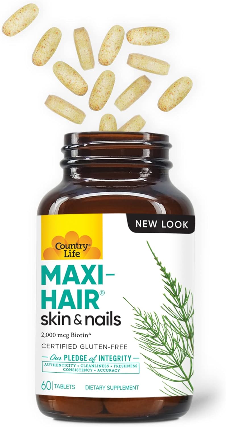 Country Life Maxi-Hair With 2000Mcg Of Biotin, Nourishes Hair, Skin And Nails 60 Tablets, Certified Gluten Free, Certifi