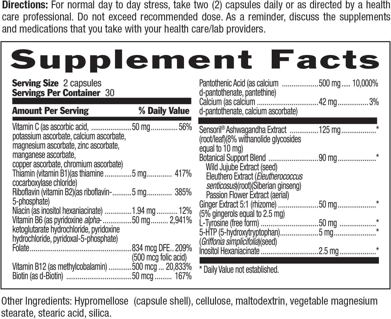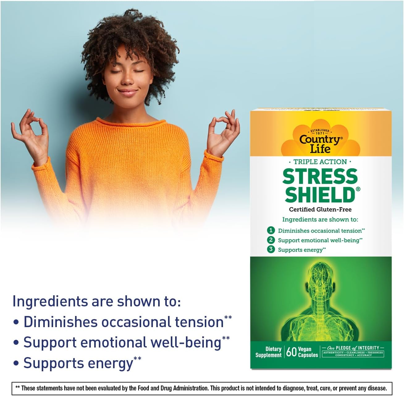 About this item Clinically Studied Sensoril Ashwagandha - Country Life Stress Shield harnesses the power of adaptogenic herbs and B-vitamins to help bolster and balance the body’s natural ability to cope with stress and irritability, promoting a calmer, more composed state of mind in challenging situations. Adaptogenic Herb Blend - Our stress shield supplement combines a powerful blend of adaptogenic herbs to support emotional well-being and mental clarity, making it a top choice for those seeking natural tension relief. Energy-Boosting B-Vitamins – Featuring B5 Pantethine, this supplement provides essential support for maintaining energy and reducing stress-related fatigue, helping you stay alert and focused all day long. Gluten-Free and Vegan Formula - Country Life Stress Shield is Certified Gluten-Free and Vegan, ensuring a natural and inclusive approach to stress management without common allergens or artificial additives. Recyclable Commitment – Our stress relief supplement comes in natural packaging and supports wind power, ensuring that your journey to tension and stress relief also contributes to a healthier planet. › See more product details,Clinically Studied Sensoril Ashwagandha - Country Life Stress Shield harnesses the power of adaptogenic herbs and B-vitamins to help bolster and balance the body’s natural ability to cope with stress and irritability, promoting a calmer, more composed state of mind in challenging situations,Adaptogenic Herb Blend - Our stress shield supplement combines a powerful blend of adaptogenic herbs to support emotional well-being and mental clarity, making it a top choice for those seeking natural tension relief,Energy-Boosting B-Vitamins – Featuring B5 Pantethine, this supplement provides essential support for maintaining energy and reducing stress-related fatigue, helping you stay alert and focused all day long,Gluten-Free and Vegan Formula - Country Life Stress Shield is Certified Gluten-Free and Vegan, ensuring a natural and inclusive approach to stress management without common allergens or artificial additives,Recyclable Commitment – Our stress relief supplement comes in natural packaging and supports wind power, ensuring that your journey to tension and stress relief also contributes to a healthier planet