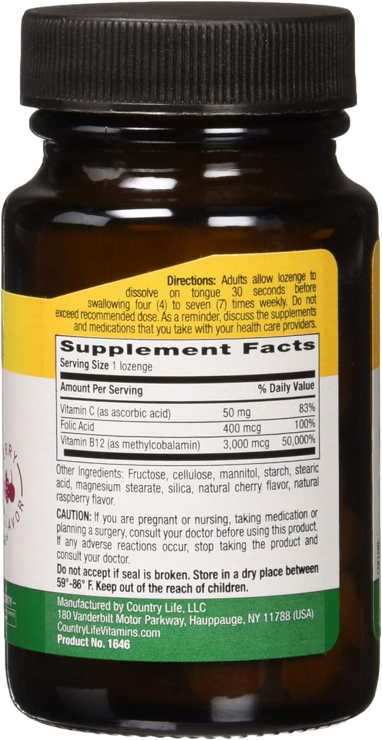 DESCRIPTION : Country Life - Superior B-12, Berry Flavored, 3000 mcg - 50 Sublingual Lozenges