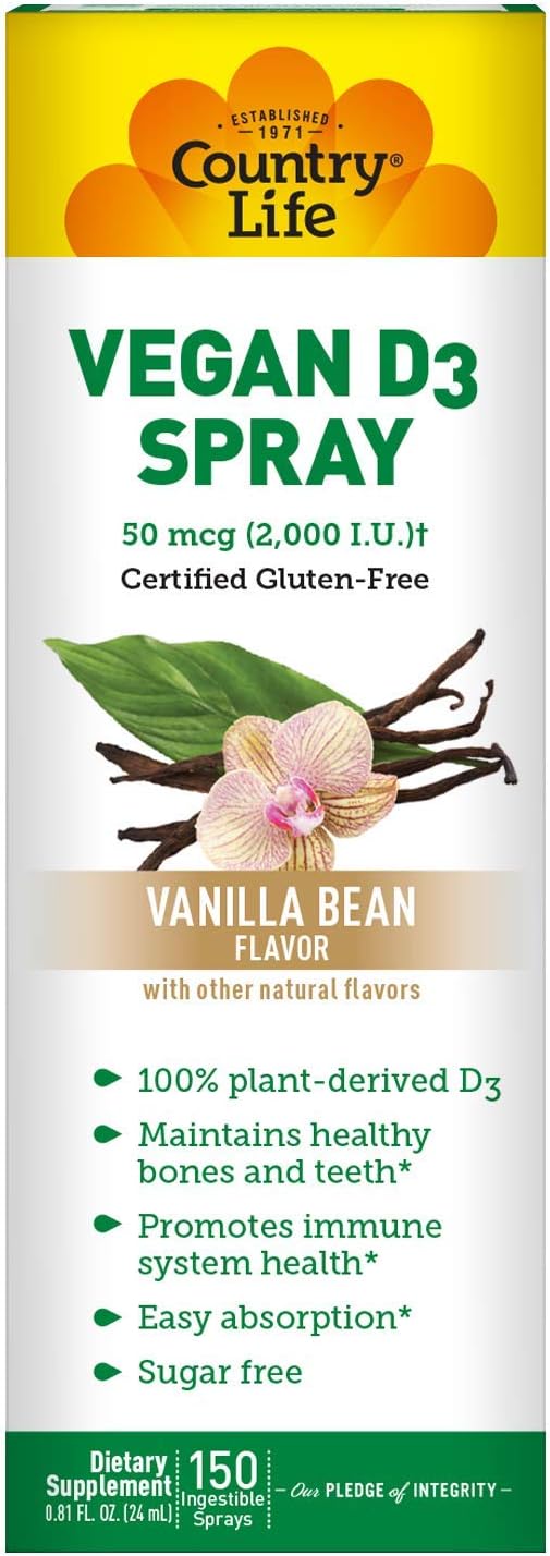 Country Life Vegan D3 Spray, 2,000 Iu Vanilla Bean Flavor, 150 Vegetarian Sprays, Certified Gluten Free, Certified Vegetarian