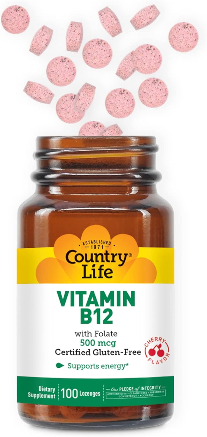 DESCRIPTION : Country Life Vitamin B12 with Folate, Supports Energy & Red Blood Cell Production, 500mcg, 100 Lozenges, Certified Gluten Free, Certified Vegan, Certified Halal, Non-GMO Verified