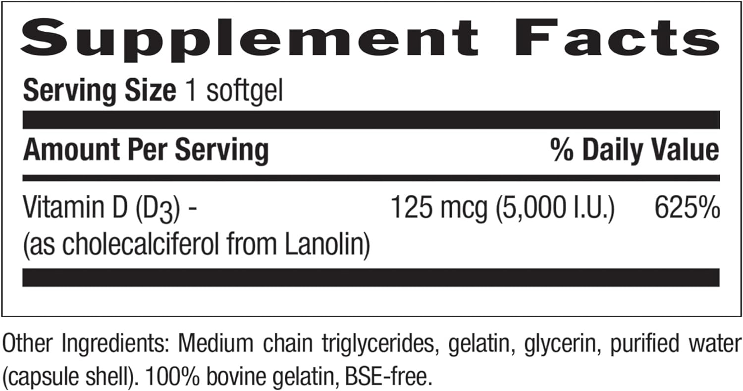 Your daily dose of the sunshine vitamin without the sun; This vitamin delivers 5000 IU of D3 to support the absorption of calcium to maintain healthy bones and teeth