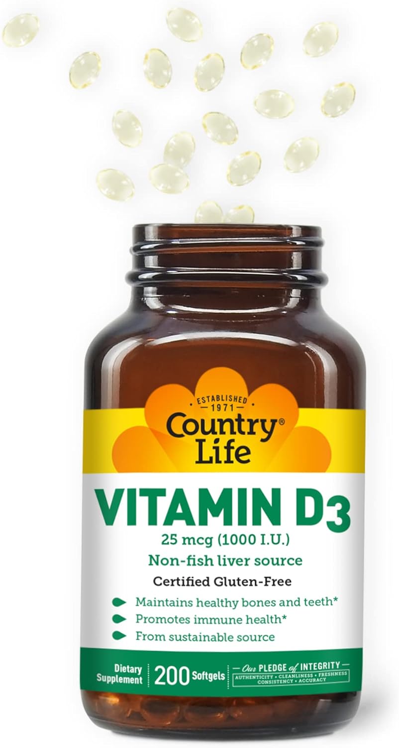 Country Life Vitamin D3, Non-Fish 1000 Iu, 200 Softgels, Certified Glu