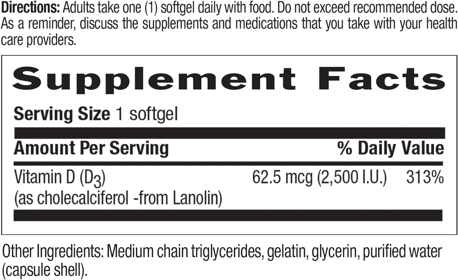 2500 IU Vitamin D3 from lanolin โ Clean sourced, non-fish supplement made from lanolin (a sustainable and safe source)