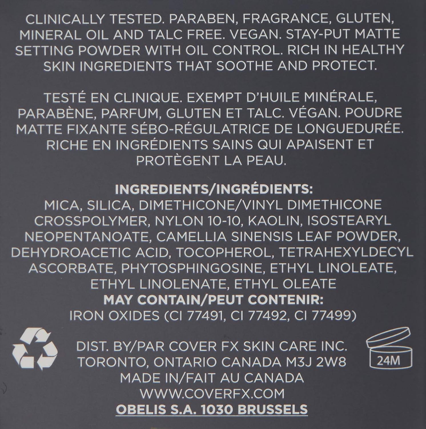 ABOUT THE PRODUCT: 1 > MATTE SETTING POWDER; This talc-free loose powder instantly sets makeup without settling into fine lines and minimizes shine while imparting a matte finish 2 > VEGAN & CRUELTY-FREE: The skin-loving formula is enriched with kaolin clay to control shine and blur the appearance of pores 3 > HOW TO USE: After applying makeup, pick up powder using a powder brush and tap off the excess. Press, roll and lightly sweep across the face for an instant matte finishProduct Description This talc-free, loose setting powder instantly imparts a soft-focus, matte finish to the skin, extending wear, and minimizing transfer without adding any color to the skin. Brand Story Cover FX was founded on the belief that people can have both clean ingredients and high performance in one brand. We invite you to mix, experiment and play to create your formula for beauty