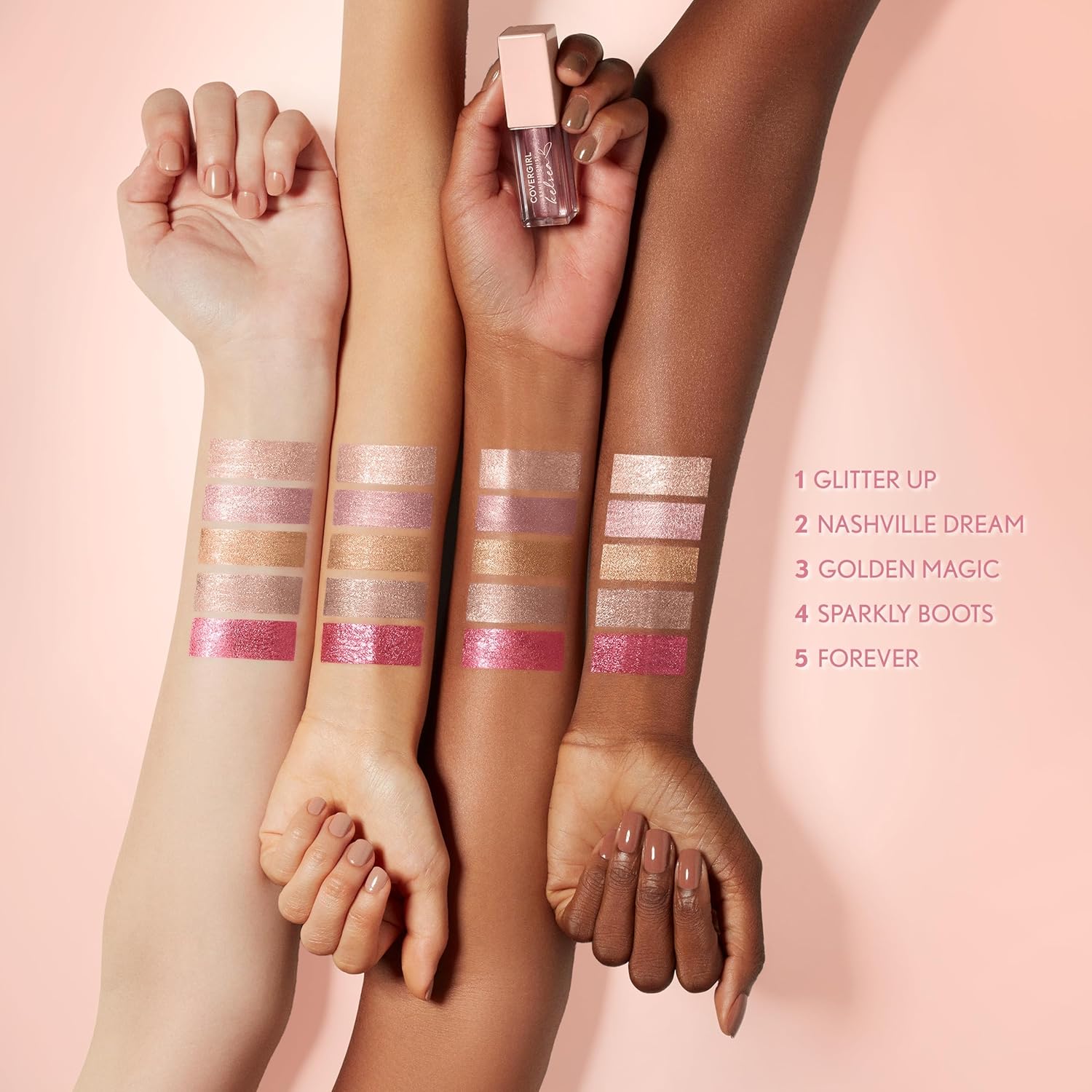 The Exhibitionist by Kelsea Ballerini Liquid Glitter Eyeshadows are 5 rose gold eyeshadow shades, personally created by Kelsea and inspired by her favorite holiday looks. This highly pigmented, multi-dimensional metallic eyeshadow has a glittery finish and lasts all day. Application is easy and effortless thanks to one-swipe color payoff. Glide it on and build it up to highlight eyes in time for the holidays,Multi-dimensional shimmer,Super-saturated bold color,Non-sticky texture,Quick dry down to minimize fallout,Approved under Cruelty-Free International (CFI)'s Leaping Bunny Program