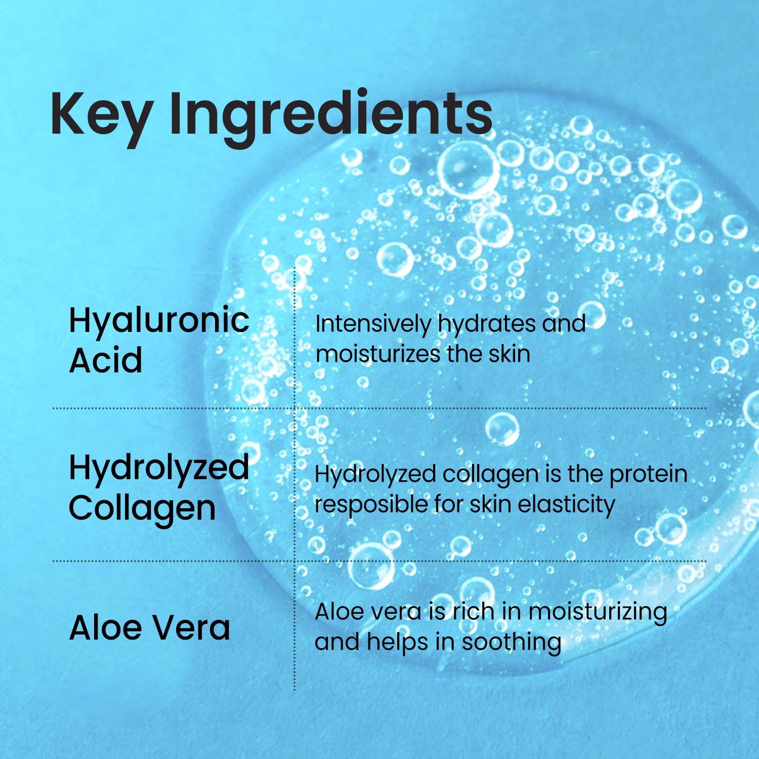 [Key Ingredients] 40% of Hyaluronic acid + Hydrolyzed Collagen+ Panthenol (B5)+ Allantoin + CICA+ PLANT COMPLEX 6 -Hyaluronic acid hydrates dehydrated skin and keep moisture barrier in skin - Pantheno hydrates dry, damaged and sensitive skin - Collagen firm and nourishes skin - Allantoin soothes red and irritated skin (Blemishes)