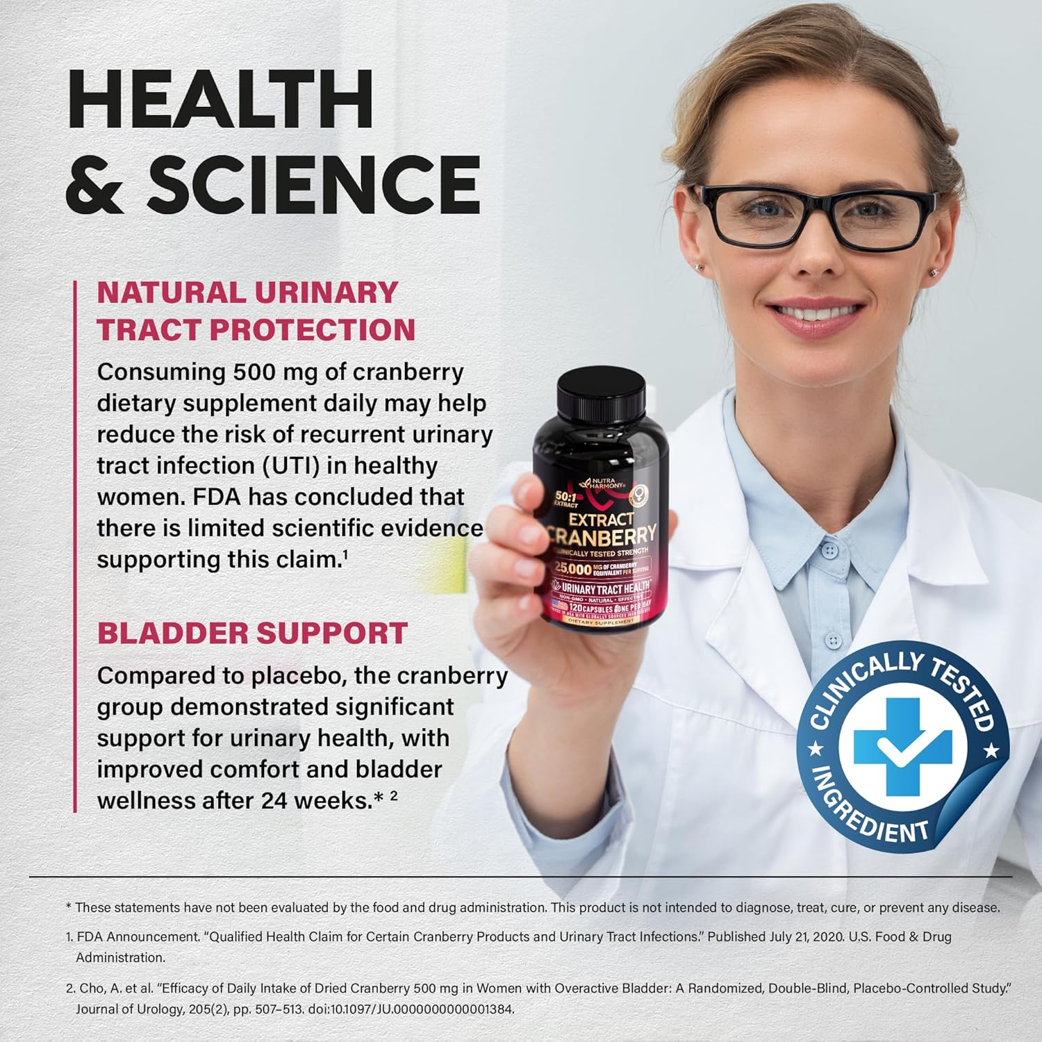 50:1 Cranberry Extract 500mg β 50:1 Ultra-Potent Extract Cranberry supplement: delivers 500mg per serving, concentrated from 25,000mg of fresh cranberries for exceptional potency. Cranberry capsules are packed with antioxidants to help combat free radicals, support urinary health, and contribute to overall wellness