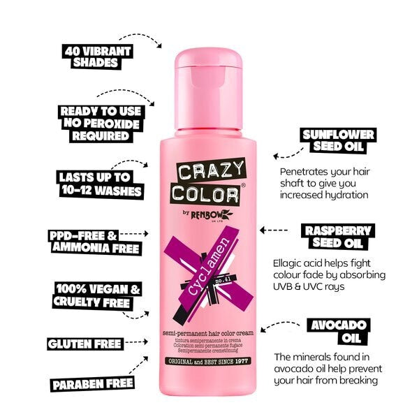 Product Information:Achieve head turning looks with Crazy Color Semi Permanent Hair Dye! It is perfect for mixing up your look. The conditioning formula makes it easy to apply, while hydrating the hair,Features:Semi Permanent Hair Color - Ammonia Free - 100% Vegan & Cruelty-Free - Ready To Use – No Peroxide Required - Lasts 8-12 Washes - This Semi-Permanent Deep Pink Hair Dye Is Inspired By The Cyclamen Flower Due To Its Intense Rich Color - What’S Special About Cyclamen Is That It Works Over Blonde To Light Brunette Hair Tones, And Still Comes Through With A Pop Of Vibrant Color!,Warning or Restrictions:Read & Follow Instructions: Hair colourants can cause severe allergic reactions. A preliminary skin sensitivity test should be made. This product must not be used for dyeing the eyelashes or eyebrows. This product is not intended for use on persons under the age of 16. Temporary 'black henna' tattoos may increase your risk of allergy. Do not colour your hair if: you have had a rash on your face or a sensitive, irritated or damaged scalp, you have ever experienced any reaction after colouring your hair or you have experience a reaction to a temporary 'black henna' tattoo in the past. Crazy Color may stain. KEEP OUT OF REACH OF CHILDREN,Product Specification:Aqua (Water), Cetearyl Alcohol, Propylene Glycol, Ceteareth-20, Guar Hydroxypropyltrimonium Chloride, Distearoylethyl Hydroxyethylmonium Methosulfate, Ceteareth-30, Citric Acid, Formic Acid, Methylchloroisothiazolinone, Methylisothiazolinone, Basic Red 51, Basic Orange 31, Basic Violet 16, Basic Yellow 87,Product Uses:Do not mix with peroxide. To ensure color is as expected test on a small swatch before application. For best results apply to pre-lightened /bleached hair. Directions: After shampooing towel dry hair and apply Crazy Color evenly over hair (wear gloves). Leave for 15-30 minutes, then rinse thoroughly,Recyclable:Plastic bottle is recyclable