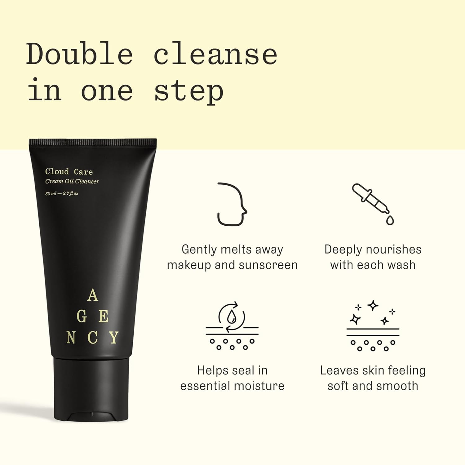 About this item HYDRATE AS YOU CLEANSE β Ultra-sensorial, conditioning face cleanser that transforms from cream to oil as you wash away impurities. Skin is left freshly-cleansed, smooth, soft, and hydrated MELTS AWAY MAKEUP β Effortlessly melts away waterproof makeup, sunscreen, and other impurities, without stripping the skin or leaving a greasy after-feel IMMEDIATE RESULTS β 90% of subjects said their skin had a nice glow after using the product, based on a 31-subject consumer questionnaire immediately after use FOR ALL SKIN TYPES β Supports your anti-aging skin care product routine. Use morning and night. Effective on its own or as part of a double cleanse. Gentle enough for mature, dry and sensitive skin. Ophthalmologist-tested DERMATOLOGIST-TESTED - Non-comedogenic, fragrance free, dye free, paraben free, vegan, cruelty free (Leaping Bunny Certified) AGENCY β Dermatologist-designed skin care products formulated to improve signs of aging. This product pairs well with any of Agency's active anti-aging skincare formulas βΊ See more product details,HYDRATE AS YOU CLEANSE β Ultra-sensorial, conditioning face cleanser that transforms from cream to oil as you wash away impurities. Skin is left freshly-cleansed, smooth, soft, and hydrated,MELTS AWAY MAKEUP β Effortlessly melts away waterproof makeup, sunscreen, and other impurities, without stripping the skin or leaving a greasy after-feel,IMMEDIATE RESULTS β 90% of subjects said their skin had a nice glow after using the product, based on a 31-subject consumer questionnaire immediately after use,FOR ALL SKIN TYPES β Supports your anti-aging skin care product routine. Use morning and night. Effective on its own or as part of a double cleanse. Gentle enough for mature, dry and sensitive skin. Ophthalmologist-tested,DERMATOLOGIST-TESTED - Non-comedogenic, fragrance free, dye free, paraben free, vegan, cruelty free (Leaping Bunny Certified),AGENCY β Dermatologist-designed skin care products formulated to improve signs of aging. This product pairs well with any of Agency's active anti-aging skincare formulas