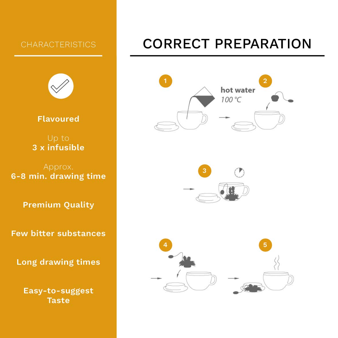 Characteristics: The Blooming Tea Tea Blossom Opens In The Cup And Unfolds Its Full Beauty And Light Fruity Taste. Up To Three Infusions Per Ball Are Possible. The Mild White Tea Is Sweetly Complemented By Marigolds, Jasmine Blossoms & Roses And Is Flavoured With Peach, Vanilla, Lemon Or Jasmine. Due To Its High Quality And Low Content Of Bitter Substances, The Tea Tolerates Long Infusion Times And Guarantees An Extended Visual Experience