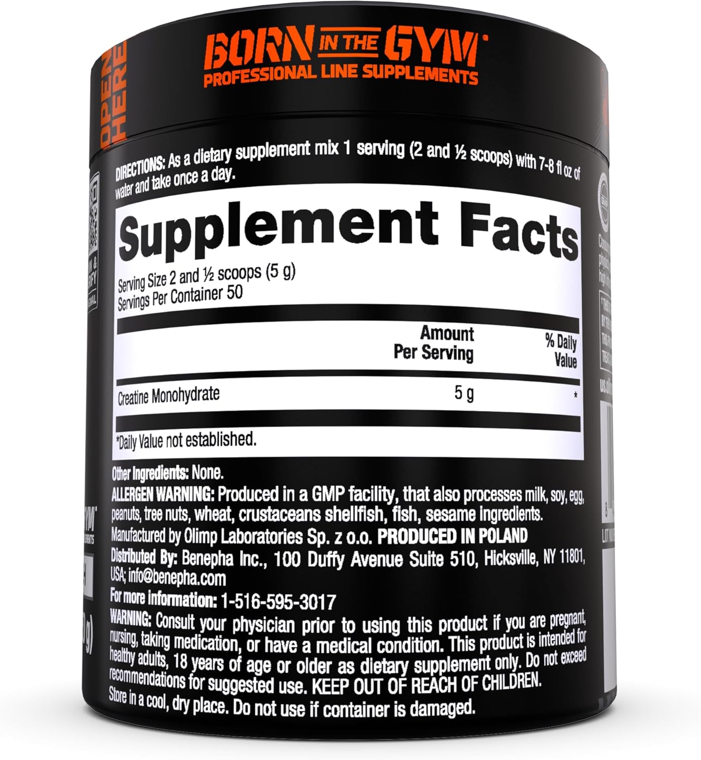 About this item High concentration โ thanks to the enormously high degree of micronisation, it is instant, offers excellent pharmaceutical quality and purity. The effect of Creatine Monohydrate Powder has been proven in numerous clinical and sporting studies. Effect: available creatine goes into phosphocreatine. The intake of creatine increases performance during short-term intensive physical exercise (or exertion) - an effect is achieved with 5 of creatine per day. Reduce feelings of fatigue and tiredness and maintain normal energy metabolism (magnesium, vitamin B6). Complementary: If you choose dietary supplement with Olimp Creatine Monohydrate, please note that products from the Olimp Born In The Gym brand are not a substitute for a balanced diet and therefore only serve as a supplement. High micronization of the powder influences excellent solubility and thus allows for optimal saturation of muscles with creatine, which in muscle cells is transformed into phosphocreatine (the main energy carrier) - the more phosphocreatine, the muscles gain more additional energy and as a result you can train longer and more effectively! Made in Europe with 100% quality guarantee โ OLIMP manufactures its products with more than 20 years of experience. The supplements are made with the best ingredients. Olimp, premium quality dietary supplement for hobby and professional athletes. See also the other offers from OLIMP in our store. โบ See more product details,High concentration โ thanks to the enormously high degree of micronisation, it is instant, offers excellent pharmaceutical quality and purity. The effect of Creatine Monohydrate Powder has been proven in numerous clinical and sporting studies,Effect: available creatine goes into phosphocreatine. The intake of creatine increases performance during short-term intensive physical exercise (or exertion) - an effect is achieved with 5 of creatine per day. Reduce feelings of fatigue and tiredness and maintain normal energy metabolism (magnesium, vitamin B6),Complementary: If you choose dietary supplement with Olimp Creatine Monohydrate, please note that products from the Olimp Born In The Gym brand are not a substitute for a balanced diet and therefore only serve as a supplement,High micronization of the powder influences excellent solubility and thus allows for optimal saturation of muscles with creatine, which in muscle cells is transformed into phosphocreatine (the main energy carrier) - the more phosphocreatine, the muscles gain more additional energy and as a result you can train longer and more effectively!,Made in Europe with 100% quality guarantee โ OLIMP manufactures its products with more than 20 years of experience. The supplements are made with the best ingredients. Olimp, premium quality dietary supplement for hobby and professional athletes. See also the other offers from OLIMP in our store
