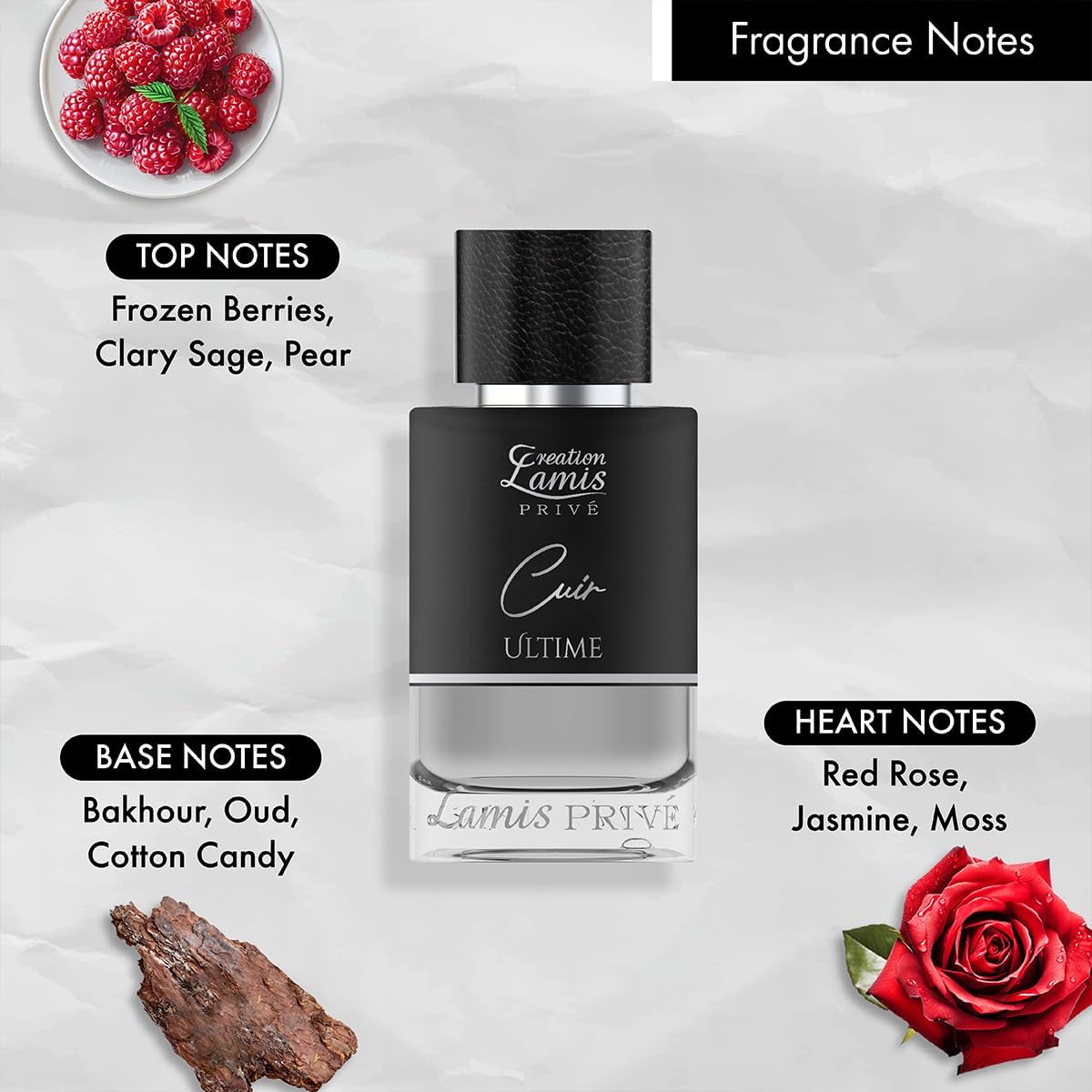 Product description ABOUT CREATION LAMIS:- Being wrapped in and exuding an enchanting fragrance should not be a dream, but a right for each & every one of us. Creation Lamis strives to make this a reality for all of you. Creation Lamis is an exquisite collection of premium fragrances designed for each and every one of us. So go ahead, treat yourself to one of our heady and exotic fragrances today. UNDERSTANDING FRAGRANCE NOTES:- You will often see top, middle, and base notes being used to describe a fragrance. The top notes of a fragrance, also known as the head or opening notes, are what you smell immediately after spraying your perfume or aftershave; they evaporate quickly but will form the first impression of the fragrance. The middle or heart, notes appear once the top notes have disappeared. These notes are the main body of the fragrance, lasting longer than the top notes and are usually well-rounded. Base notes are what is left at the end; it is this smell that you remember the most. The base notes are the longest lasting, mixing with middle notes to create the full body of the perfume of aftershave. FEATURES:- Blissful scent keeps you uplifted all-day. Compact form of the bottle makes it easy to store. Perfume is activated by body heat therefore you should apply perfume on your skin at the main pulse points, the inside of your wrist, on the neck, behind the ear, elbows and behind your knees. Safety Warning For external use only,Brand - Creation Lamis Privé | Fragrance Type: Eau de Parfum,Size - 100ML | Perfume Name: Cuir Ultime | Fragrance: Leather, Oriental,Top Note : Frozen Berries , Clary Sage, Pear,Heart Notes : Red Rose, Jasmine, Moss,Base Notes : Bakhour, Oud, Cotton Candy,Mindful Values – Perfect for Everyday Use | Long Lasting Freshness | Nontoxic | Cruelty Free | Easy to carry Everywhere