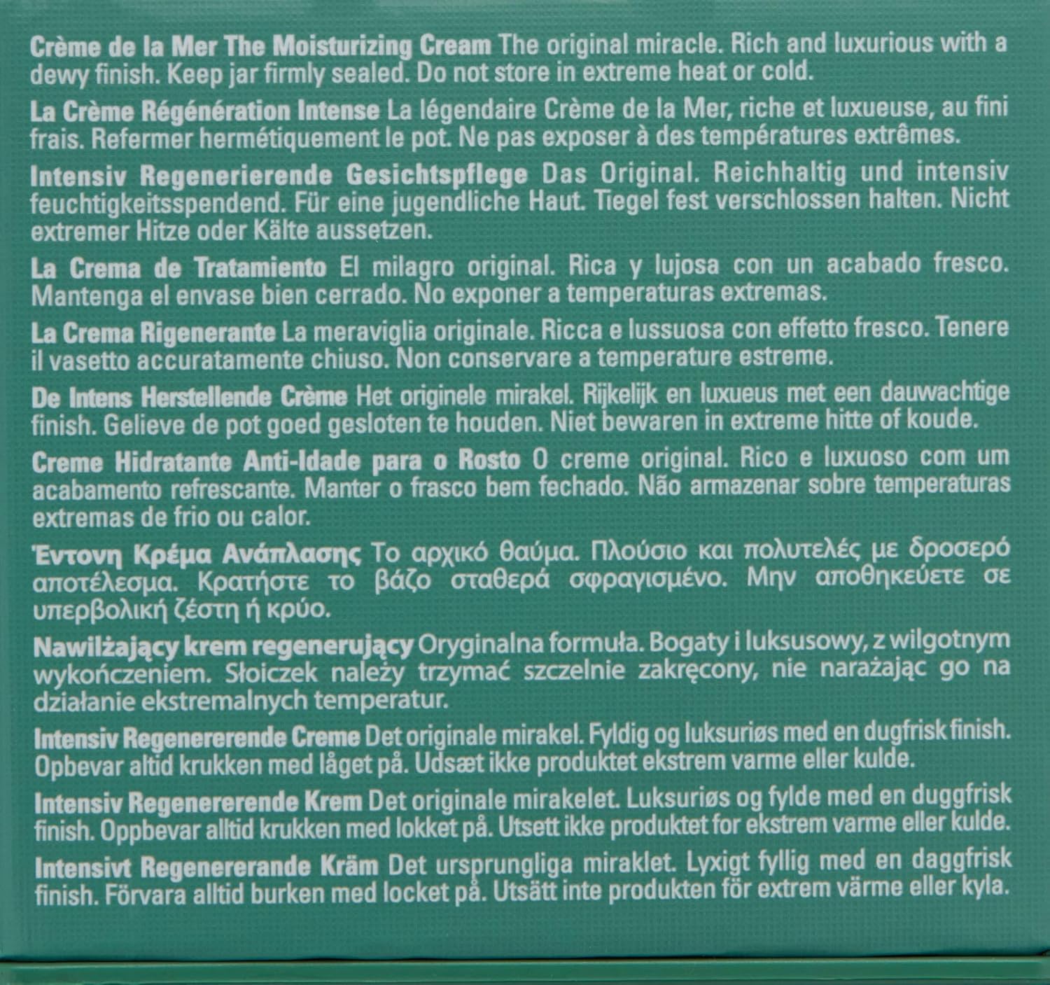 Product Description La Mer Crème de la Mer Moisturizing Cream 100ml is a luxurious, ultra-rich moisturizer that delivers deep hydration and helps soothe, smooth, and renew dry or sensitive skin. Infused with Miracle Broth™, it restores radiance, reduces fine lines, and improves skin’s firmness and texture. Ingredients Algae extract (kelp), cyclopentasiloxane, petrolatum, glyceryl distearate, phenyl trimethicone, butylene glycol, hydrogenated vegetable oil, cholesterol, butyrospermum parkii (shea butter), steareth-10, dimethicone, glyceryl stearate, polysilicone-11, sesamum indicum (Sesamum Indicum). ) Sameeeeeago Sativa (alfalfa) seed powder, Helianthus annuus (sunflower) seedcake, Prunus Amygdalus dulcis (sweet almond) seed flour, eucalyptus globulus (eucalyptus) leaf oil, sodium gluconate, copper gluconate, calcium gluconate, magnesium gluconate, zinc gluconate, tocopheryl succinate, sesame, sesame, sesin. um indicum (session ame) seed powder, water, citrus aurantifolia (lime) peel extract, laminaria digitata extract, crithmum maritimum extract, salicornia herbacea extract, plankton extract, chlorella vulgaris extract, glycine soy (soybean) seed extract, glycerin, caffein, sea salt, micrococcus lysate. diethylhexyl succinate, adenosine phosphase ate, creatine, hydrolyzed algin, isocetyl stearoyl stearate, cetyl alcohol, sucrose, acetyl hexapeptide-8, glucose oxidase, polyacrylamide, acetyl carnitine hcl, glucose, caprylic/capric triglyceride, c13-14 isoparaffin, tocoptocop. heryl acetate ate tetrahexyldecyl ascor. Bat, Sodium PC a, Glycosaminoglycans, Urea, Distearyldimonium Chloride, Dipalmitoylhydroxyproline, Sodium Hyaluronate, Laureth-7, Lecithin, Trehalose, Polyquaternium-51, Lactoperoxidase, Hydroxypropylcyclodextrin, Cyanocobalamin, Pentylene Glycol, Fragrance (Parfum) um), Disis Odium edta, Bht, Citronellol, Hydroxycitronellal, Geraniol, Linalool, Limonene, Potassium Sorbate and Phenoxyethanol P.when('A').execute(function(A) { A.on('a:expander:toggle_description:toggle:collapse', function(data) { window.scroll(0, data.expander.$expander[0].offsetTop-100); }); }); Safety Warning For external use only See more,It is recommended for day time use,Nourishes skin and maintains moisture in cells,Renewed and energized, skin looks youthfully radiant