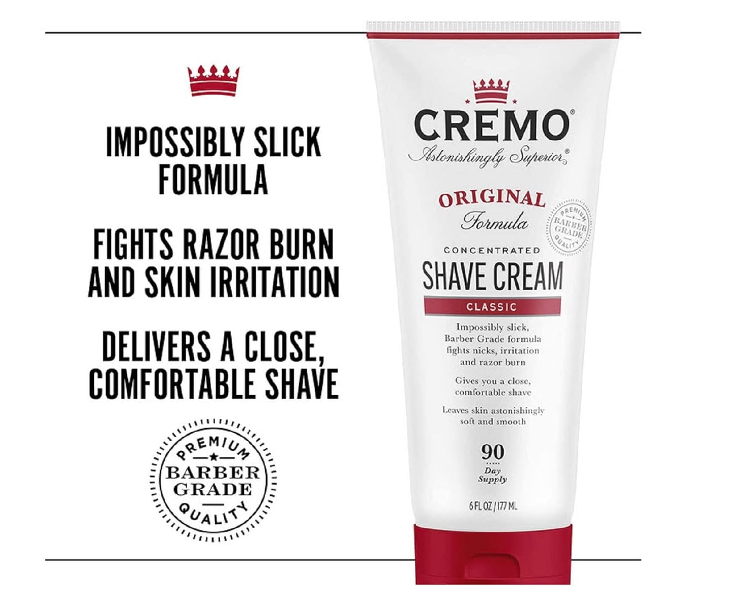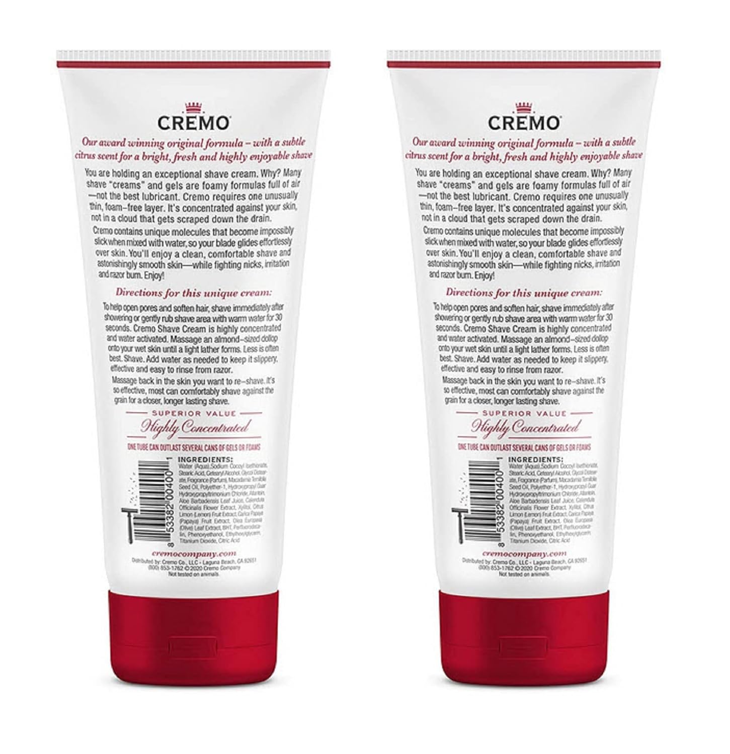 Cremo Shave Cream Our shave creams are made of super-slick molecules that provide a slippery interface between sharp blade and sensitive skin; you'll enjoy an effortlessly close shave with virtually no irritation. Each Cremo Shave Cream is formulated to make your grooming ritual quick, reliable and even enjoyable. Inspired by the latest insights of cosmetic science and a deep respect for tradition, Cremo promises no gimmicks and no fluff. That's the difference between shave cream and shave cream with soul. Ingredients: Water (Aqua), Sodium Cocoyl Isethionate, Stearic Acid, Glycol Distearate, Cetearyl Alcohol, Macadamia Ternifolia Seed Oil, Polyether-1, Hydroxypropyl Guar Hydroxypropyltrimonium Chloride, Allantoin, Aloe Barbadensis Leaf Juice, Calendula Officinalis Flower extract, Xylitol, Citrus Medica Limonum (Lemon) Fruit and Carica Papaya Fruit Extract, Olea Europaea (Olive) Leaf Extract, Linalool, Limonene, BHT, Perfluoromethylcyclopentane, Phenoxyethanol, Ethylhexylglycerin, Titanium Dioxide, Citric Acid, Fragrance (Parfum)Impossibly slick formula fights nicks, irritation and razor burnGives you a close, comfortable shaveOriginal formula with a subtle citrus scent90-day supply, which lasts longer than average shave cream/gel