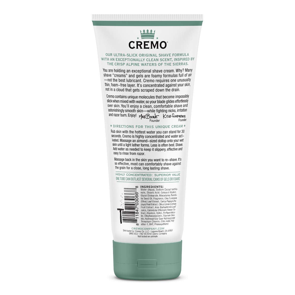 Our Ultra-Slick Original Formula Wth An Exceptionally Clean Scent, Inspired By The Crisp Alpine Waters Of The Sierra. Cremo Is An Exceptional Shave Cream. Why Many Shave ""Creams"" And Gels Are Foamy Formulas Full Of Air - Not The Best Lubricant. Cremo Requires One Unusually Thin, Foam-Free Layer. It'S Concentrated Against Your Skin, Not In A Cloud That Gets Scraped Down The Drain. Cremo Contains Unique Molecules That Become Impossibly Slick When Mixed With Water, So Your Blade Can Glide Effortlessly Over Skin. You'Ll Enjoy A Clean, Comfortable Shave And Astonishingly Smooth Skin While Fighting Nicks, Razor Burn And Irritation