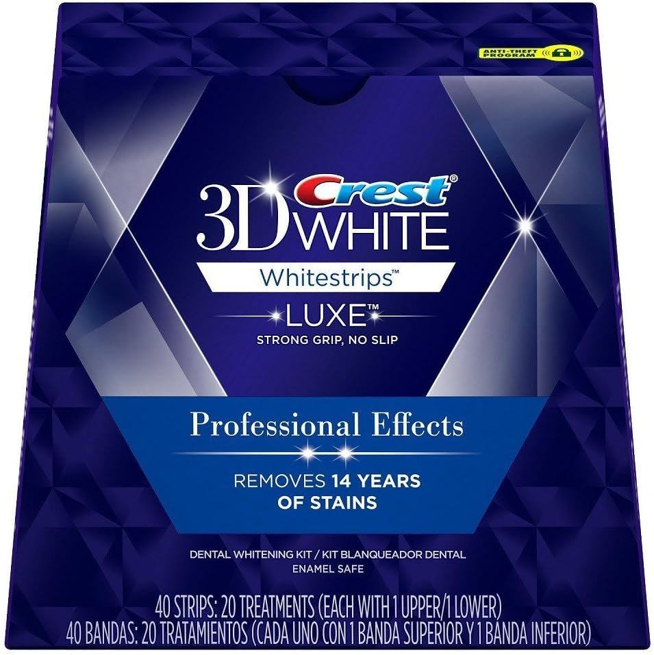 Crest 3D White Professional Effects Whitestrips provide professional level whitening results that last up to 12 months. Featuring Advanced Seal technology, these no-slip Whitestrips allow you to talk, drink water and go about your day while you whiten with no sticky mess. Use for 30 minutes, once a day for a stand out smile. Plus, you'll start seeing results after just 3 days.; Professional level whitening results that last up to 12 months.; Advanced Seal technology allows you to talk, drink water and go about your day while you whiten and the Whitestrips won't slip; Start seeing a whiter smile after just 3 days; Enamel safe. Same whitening ingredient dentists use; Give yourself a smile makeover with professional level whitening results at home; Easy application. Safe and easy to use