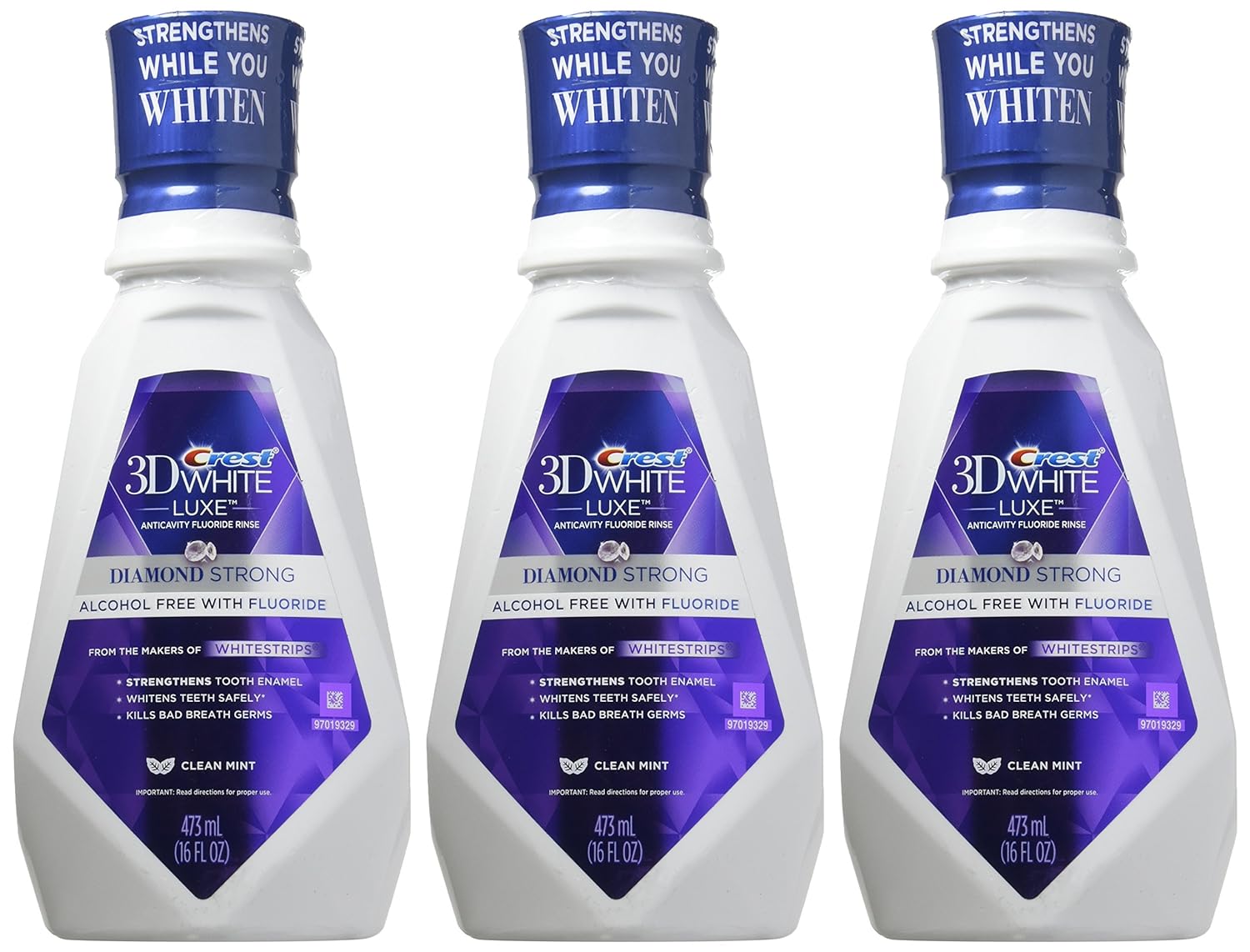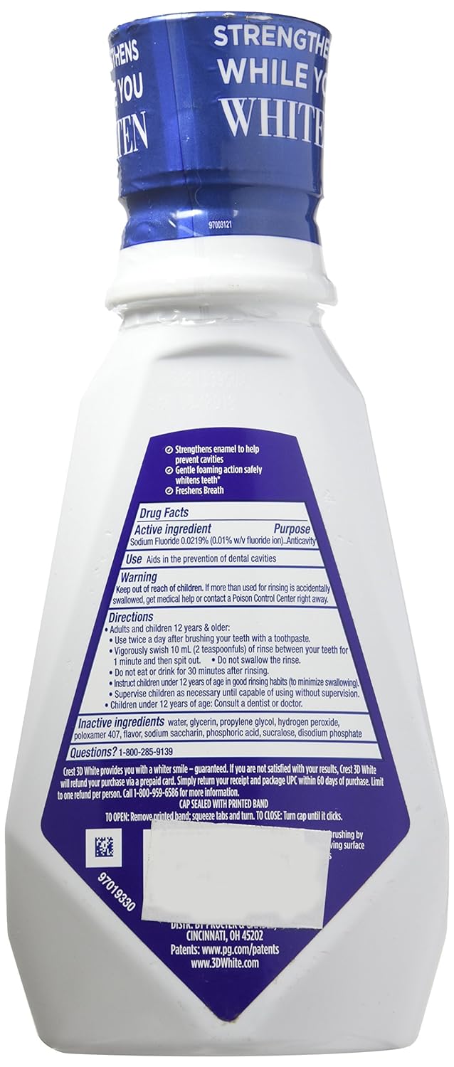 ABOUT THE PRODUCT: 1 > Strengthens tooth enamel 2 > Whitens teeth 3 > Gentle foaming actionWant a smile that's stunningly white and beautifully strong Why just whiten, when you can also strengthen Crest 3D White Luxe Diamond Strong Clean Mint Anticavity Fluoride Rinse whitens, strengthens and refreshes. Its gentle foaming action formula safely whitens teeth and helps strengthen weakened tooth enamel. Use it along with Crest 3D White Luxe Diamond Strong Toothpaste and an Oral-B 3D White Luxe Pro-Flex Toothbrush for a whiter and beautifully strong smile