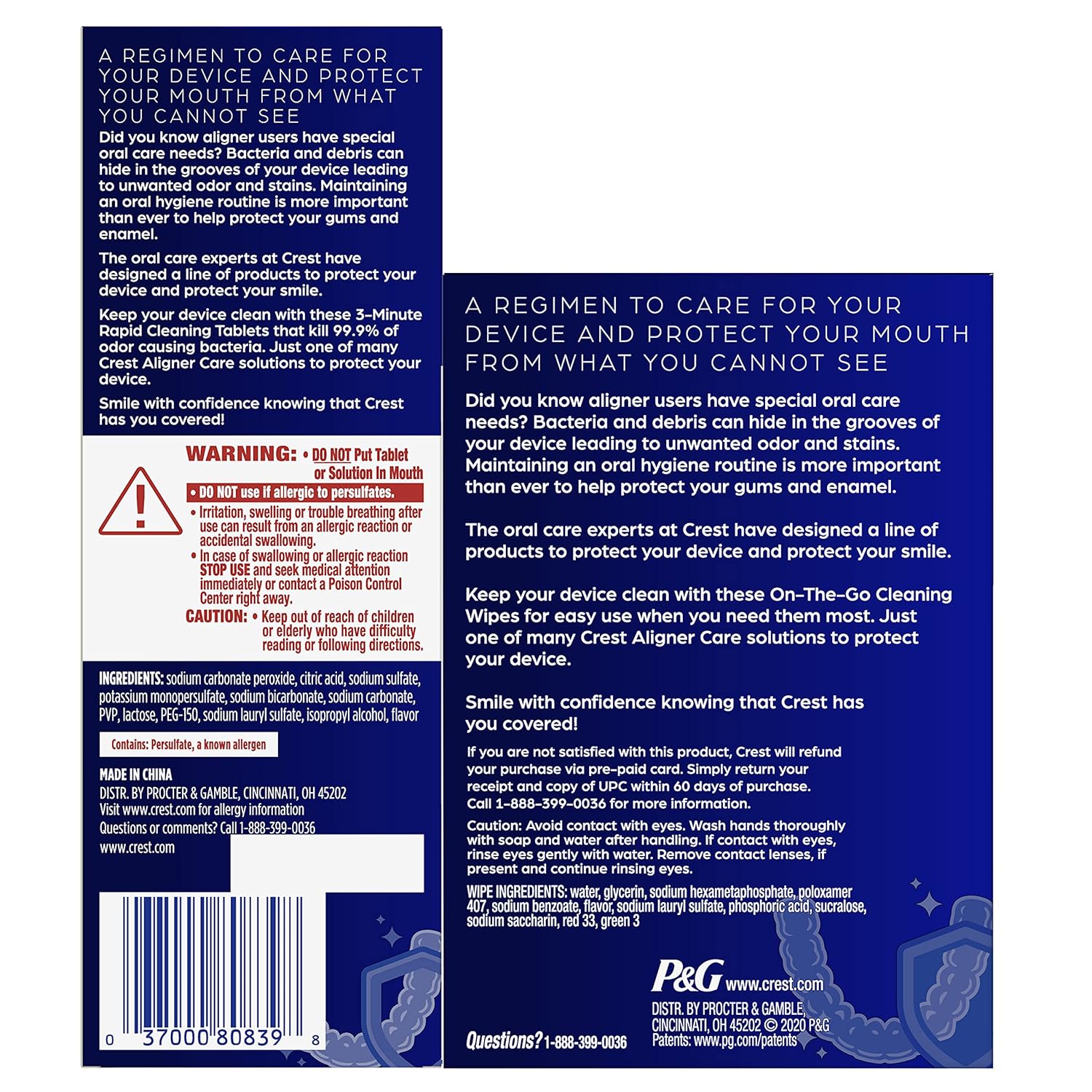 ABOUT THE PRODUCT: 1 > You will receive one 60-count Pack of Crest Aligner Care Rapid Cleaning Tablets and one 30-count Pack of Crest Aligner Care Cleaning Wipes 2 > Rapid Cleansing Tablets: Anti-bacterial cleaning for Aligners, Retainers, Mouthguards 3 > Kills 99.9% of odor-causing bacteriaSmile with confidence knowing that Crest has you covered! The oral care experts at Crest have designed a line of products to protect your device and protect your smile. Keep your device clean with these 3-Minute Rapid Cleaning Tablets that kill 99.9% of odor causing bacteria. Use these On-The-Go Cleaning Wipes for easy use when you need them most. Just two of many Crest Aligner Care solutions to protect your device