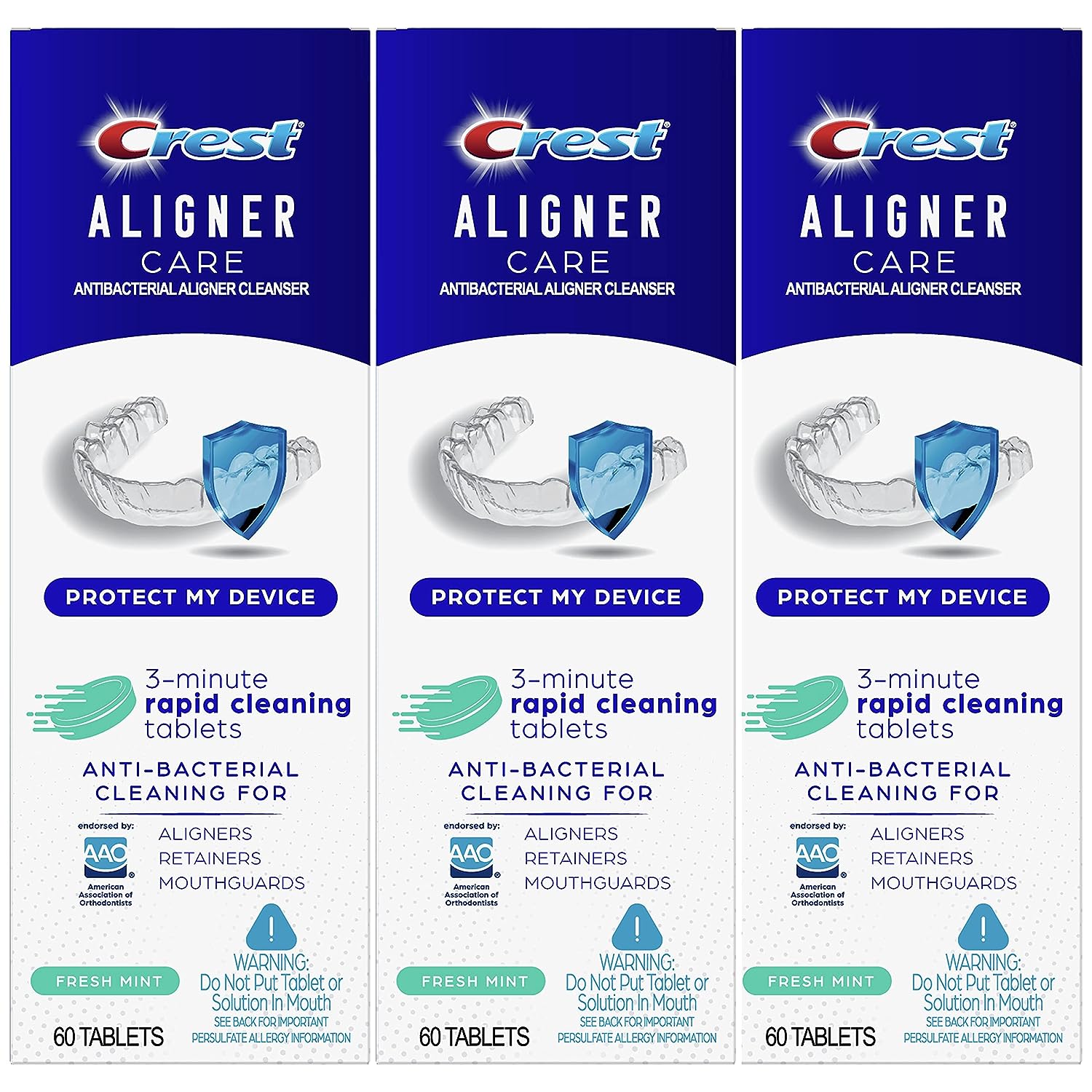 ABOUT THE PRODUCT: 1 > You will receive three 60-count Packs of Crest Aligner Care Rapid Cleaning Tablets 2 > Anti-bacterial cleaning for Aligners, Retainers, Mouthguards 3 > Kills 99.9% of odor-causing bacteriaSmile with confidence knowing that Crest has you covered! The oral care experts at Crest have designed a line of products to protect your device and protect your smile. Keep your device clean with these 3-Minute Rapid Cleaning Tablets that kill 99.9% of odor causing bacteria. Just one of many Crest Aligner Care solutions to protect your device