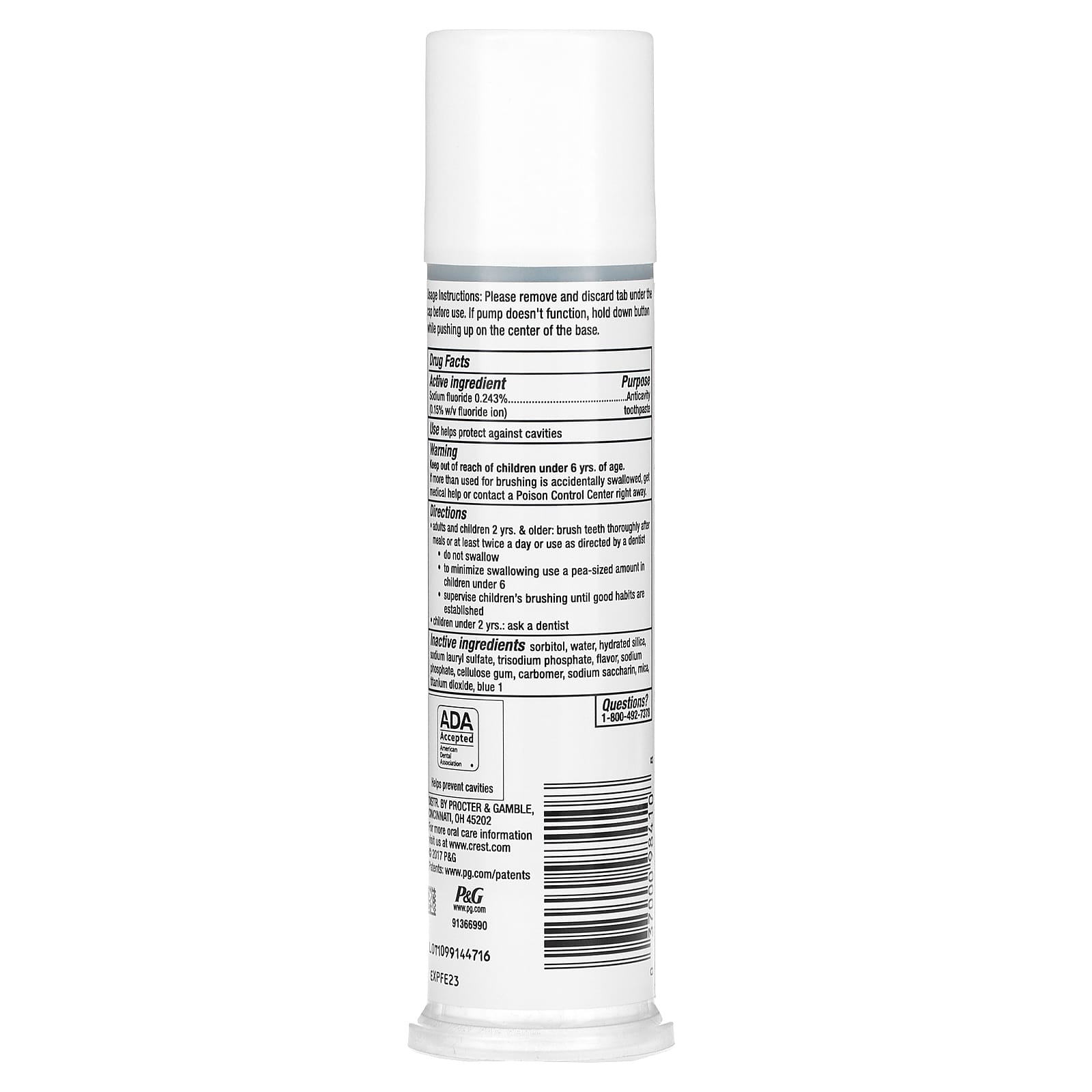 | Inactive Ingredients: Sorbitol, Water, Hydrated Silica, Sodium Lauryl Sulfate, Trisodium Phosphate, Flavor, Sodium Phosphate, Cellulose Gum, Carbomer, Sodium Saccharin, Mica, Titanium Dioxide, Blue 1. | |