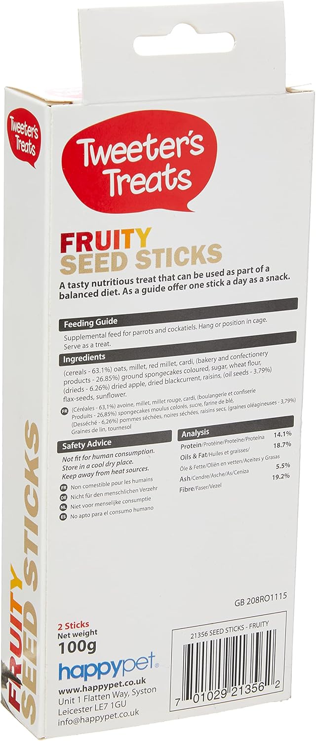 Product Description A delicious range of seed stick treats made with tasty ingredients and specifically tailored for small and large parrots. Each of the flavours comes in a box of two which, served in individual portions as a treat, can be used as part of a balanced diet. The seed sticks are easy to hang or be easily positioned in many types of enclosure. Ingredients Ingredients (cereals - 63.1%) oats, millet, red millet, cardi, (bakery and confectionery products - 26.85% ground spongecakes coloured, sugar, wheat flour dried - 6.26 dried apple, dried blackcurrent raisins (oil seeds -3.79%) fax - seeds, Sunflower P.when('A').execute(function(A) { A.on('a:expander:toggle_description:toggle:collapse', function(data) { window.scroll(0, data.expander.$expander[0].offsetTop-100); }); }); Box Contains x2 pcs seed sticks See more