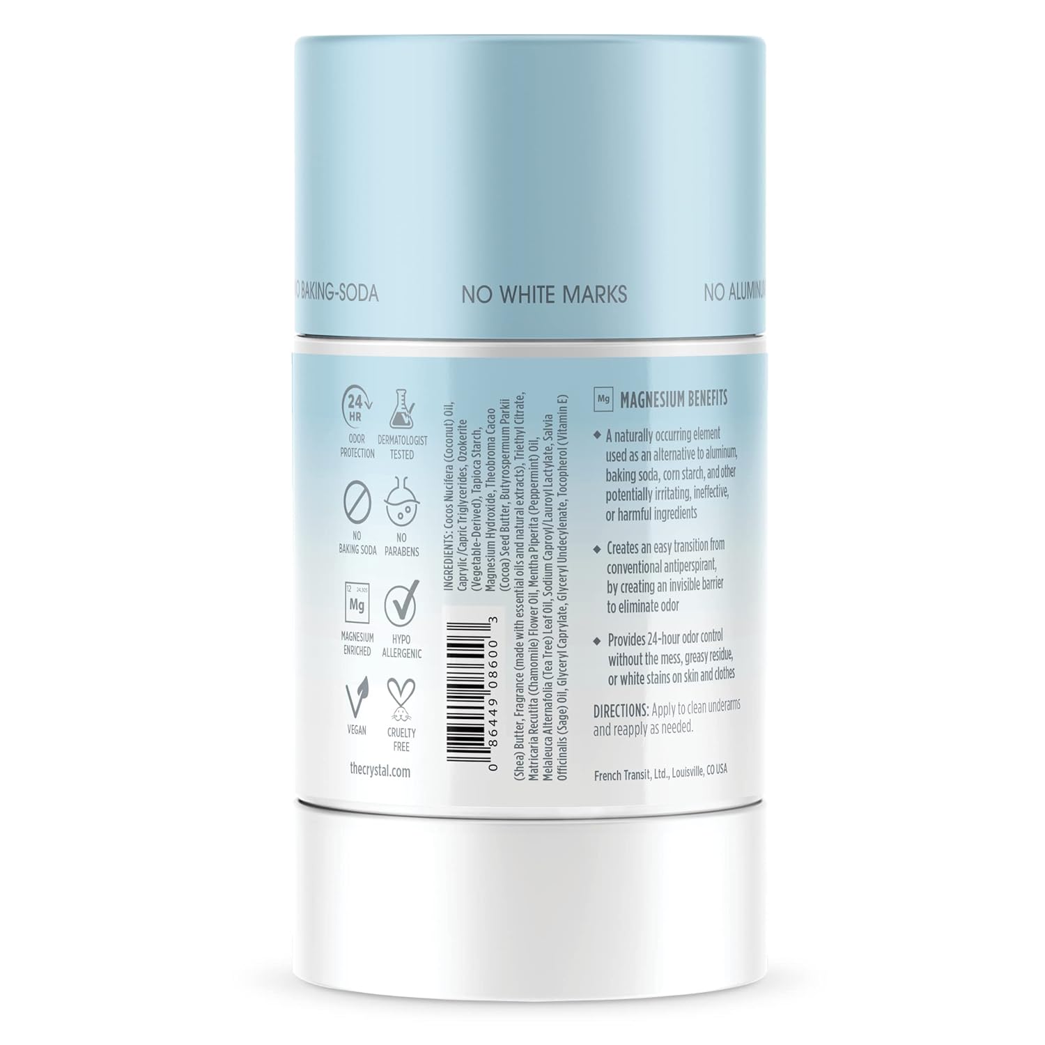 Trusted Brand with New Magnesium Innovation: More than 30 years ago, we invented the original mineral salt deodorant. Today, we continue to lead mineral innovation with Magnesium, a naturally occurring element used as an alternative to aluminum, baking soda, and other potentially irritating, ineffective, toxic, or harmful ingredients. Magnesium deodorants also help to create an easy transition from conventional antiperspirant with no detox periodSmell Good Naturally: Crystal aluminum-free deodorant for women and men dries quickly and allows the body to function naturally without blocking pores. It’s non-irritating, dermatologist-tested to be hypoallergenic, and perfect for all skin types, including sensitive skin. Available in 7 different scents: Lavender + Rosemary, Coconut + Vanilla, Cucumber + Mint, Sea Salt + Sage, Charcoal + Tea, Clean + Fresh, and Light + GentleInvisible, Non-Staining & No Greasy Residue: Crystal magnesium deodorant provides 24-hour odor control without the mess, greasy residue, or white stains on skin and clothes!Good Vibes Only: Crystal aluminum-free deodorant is vegan, cruelty-free, safe, and effective. We never test our 100% vegan deodorants on animals and use the cleanest, safest ingredients available. You will never find parabens, sulfates, phthalates, artificial fragrances, or colors here!Crystal Cares: We are committed to the safety, health, and welfare of the people who use our products and the environment. We are proud to sponsor like-minded non-profit organizations like Breast Cancer Prevention Partners and The Gentle Barn to create a better worldCrystal Magnesium Solid Stick Deodorants are made with magnesium, a superior deodorizer and an effective alternative to aluminum, baking soda, and other ingredients that can be potentially irritating, ineffective, toxic, or harmful. CRYSTAL aluminum-free deodorant for men and women provides 24-hour odor protection without blocking pores. CRYSTAL’s non-sticky, non-greasy, non-staining, and non-irritating formula is perfect for all skin types. Our magnesium deodorants are free of aluminum, parabens, sulfates, phthalates, artificial fragrances, and colors. Plus, they’re vegan and cruelty-free too. Available in 5 different 2.5 ounce scents: Lavender + Rosemary, Coconut + Vanilla, Cucumber + Mint, Sea Salt + Sage, and Charcoal + Tea Tree
