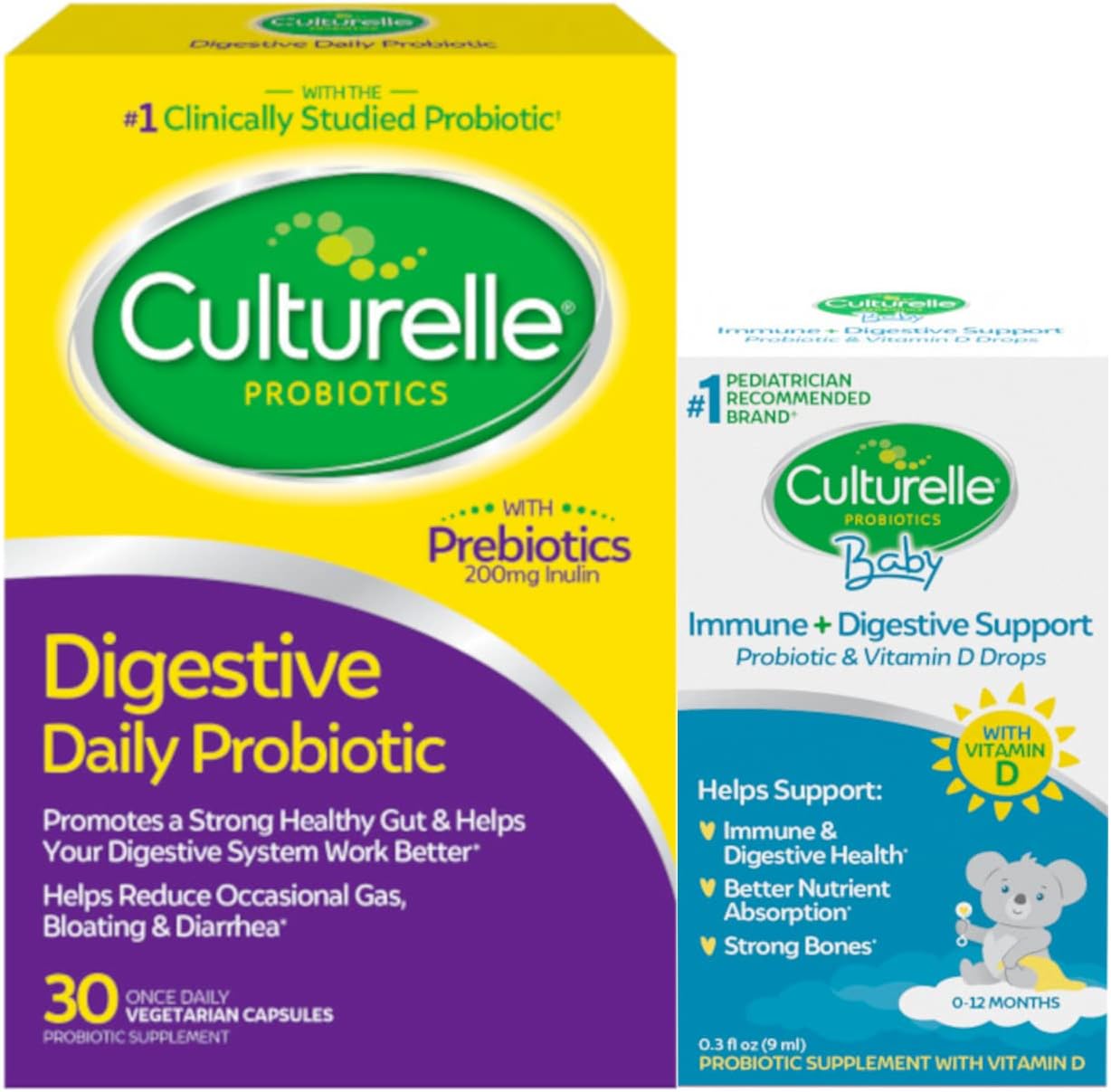 Culturelle Digestive Daily Probiotic Capsules For Men & Women, 30 Count + Culturelle Baby Immune + Digestive Support, Probiotic & Vitamin D Drops 9 Ml
