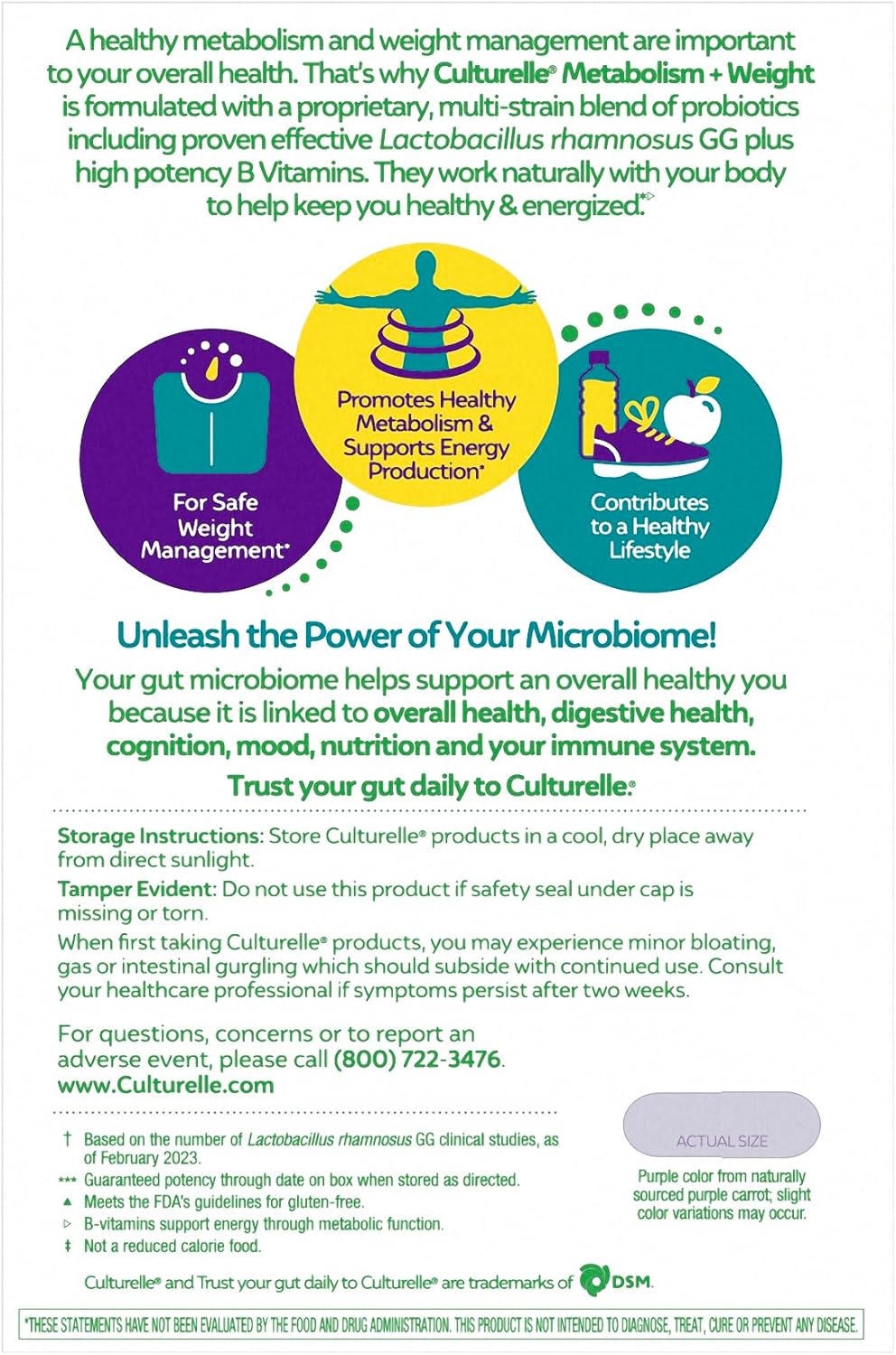 SAFE WEIGHT MANAGEMENT: Culturelle helps you safely manage your weight through the power of probiotics and B vitamins; promotes the metabolism of fats, carbs and proteins, and keeps you feeling healthy & energized; take 1 capsule per day