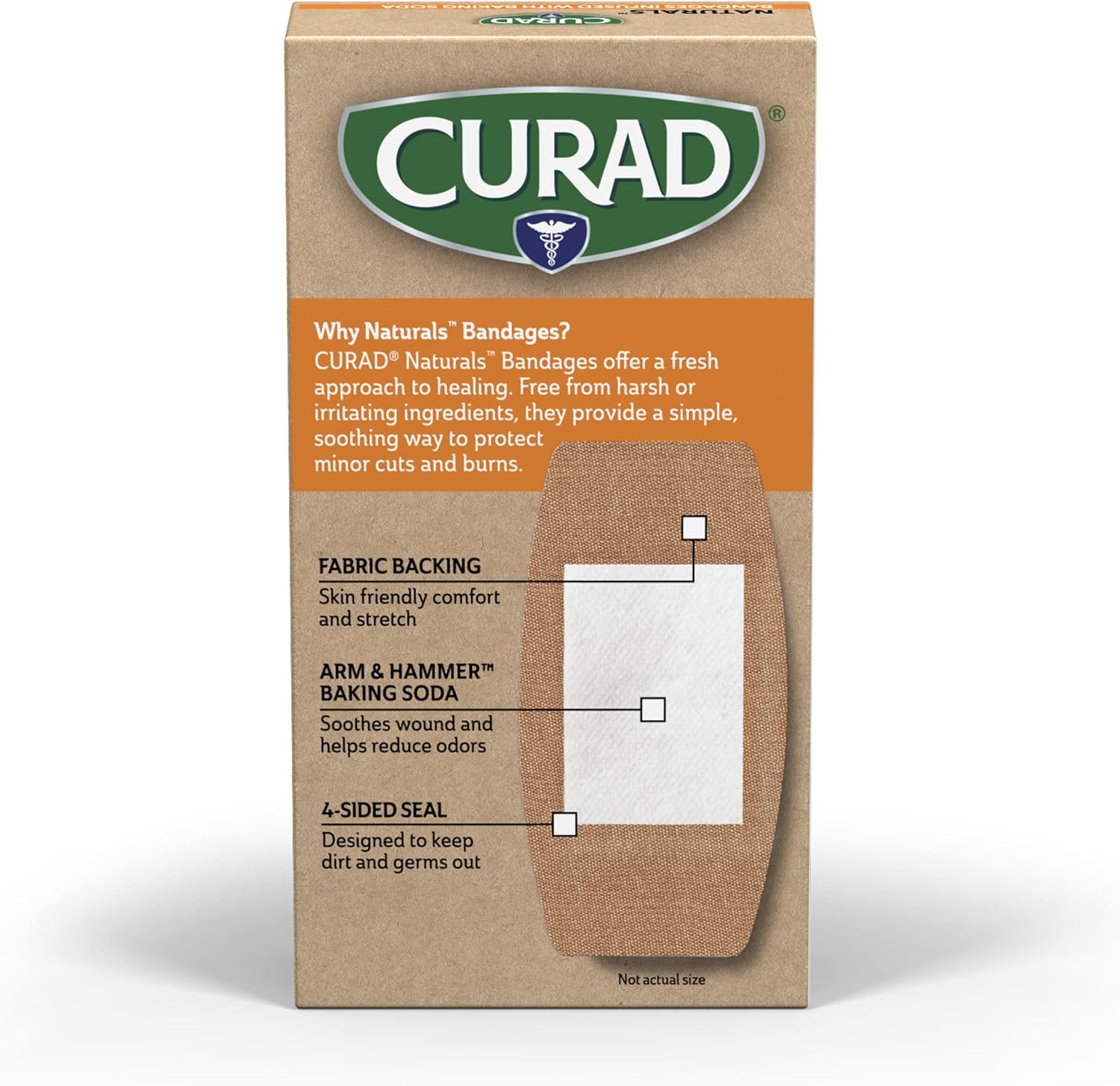 Product Description FIRST-AID KIT ESSENTIALS CURAD Naturals Bandages with ARM & HAMMER Baking Soda are a great addition to your first aid kit. Each box contains 10 sterile 2” x 4” bandages that can help treat minor cuts and scrapes. Each adhesive pad is infused with ARM & HAMMER which has natural soothing properties. It provides soothing relief to minor cuts, scrapes, and even insect stings. It also helps neutralize and reduce odor. Our bandage is also made with breathable and lightweight fabric so it feels more comfortable on your skin. It’s also made without any natural rubber latex. PROTECTS AND KEEPS OUT DIRT Each bandage has a 4-sided seal. This provides better coverage to keep out dirt. It also helps it stay on your skin as you go about your day. For longer-lasting protection for your skin, we use acrylic adhesive technology which helps keep your aloe bandage secure. Safe removal when it is time to take it off. Our adhesive pads are made with pillow-soft material that covers, cushions, and protects. It also has an extra layer of cellulose to help absorb and wick away excess drainage. This helps lock fluids away from your skin so that you can create an optimal environment for faster healing. Each self-adhesive bandage is also individually wrapped. This makes it a handy addition to your portable emergency travel first aid kit. You can carry it with you on the go! It’s perfect for use at home, for travel, and in the car. It’s a great way to always be prepared to treat minor cuts, scrapes, or burns. QUALITY YOU CAN TRUST CURAD medical supplies have been known and trusted worldwide since 1951. We aim to continue providing you with world-health care products and proven clinical solutions for home, hospital, and long-term care. Get your CURAD Naturals Bandages with ARM & HAMMER Baking Soda today to help you heal and feel better! Manufacturer Contact Information 800-633-5463,FIRST-AID KIT ESSENTIALS: CURAD Naturals Bandages with ARM & HAMMER Baking Soda are a great addition to your first aid kit. It contains 10 sterile 2” x 4” bandages for minor cuts and scrapes,HELPS REDUCE ODOR: Each bandage is infused with ARM & HAMMER which has natural soothing properties. It provides soothing relief to minor cuts and even insect stings. It also helps neutralize and reduce odor,ABSORBENT PADS: Each self-adhesive bandage is 2x more absorbent when compared to its dry weight. This helps create an environment optimal for faster healing by locking fluids away from your skin,KEEPS OUT DIRT: Each individually-wrapped bandage has a 4-sided seal. It’s made with breathable and lightweight fabric and without any natural rubber latex so it feels more comfortable on your skin,QUALITY HEALTH CARE PRODUCTS: CURAD medical supplies have been known and trusted worldwide since 1951. We aim to continue providing you with CURAD bandages to help you heal and feel better