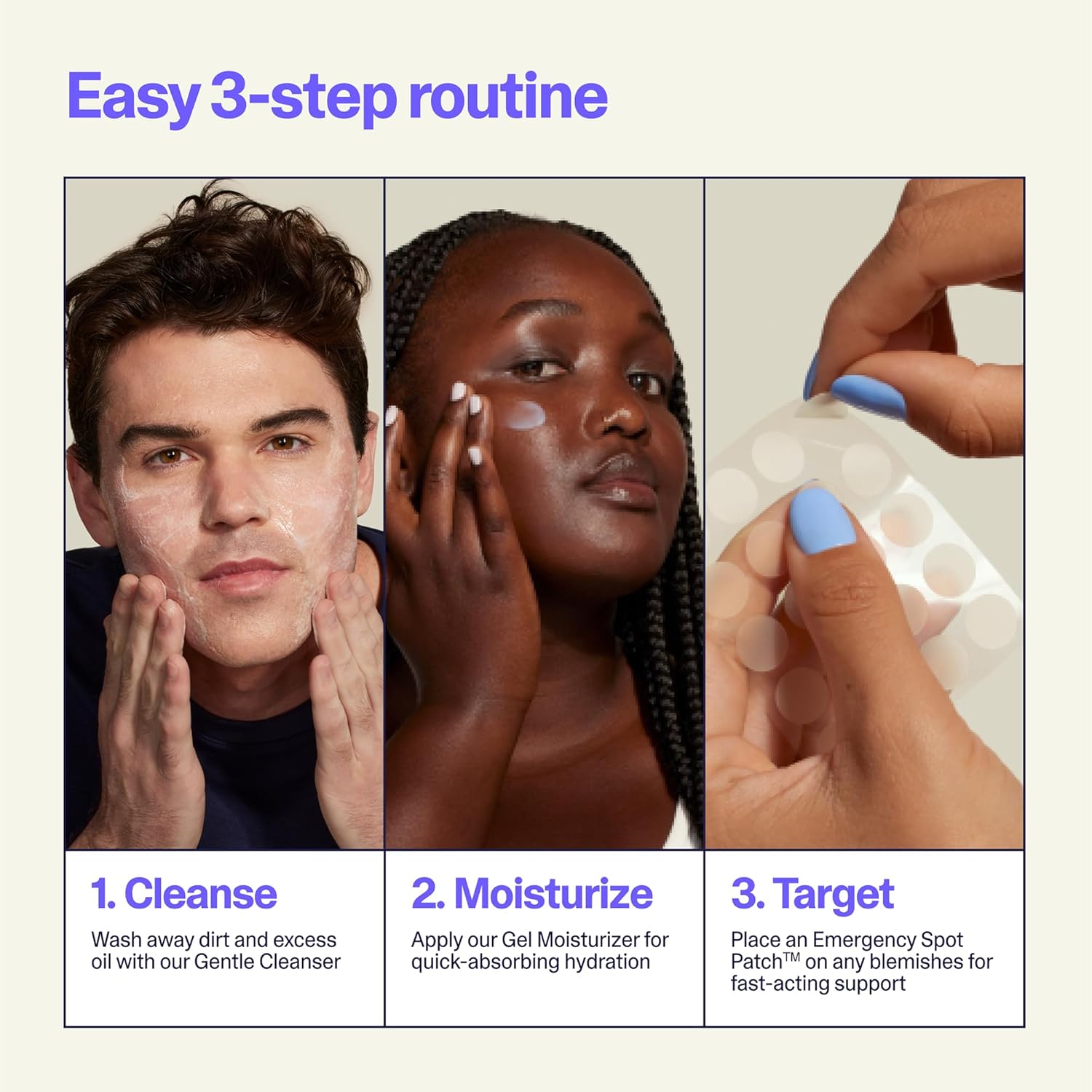 CLEANSE, MOISTURIZE, TARGET β Wash away dirt and excess oil with our Gentle Cleanser. Apply the Gel Moisturizer for a quick-absorbing hydration boost. Target sudden spots with our fast-acting Emergency Spot Patches